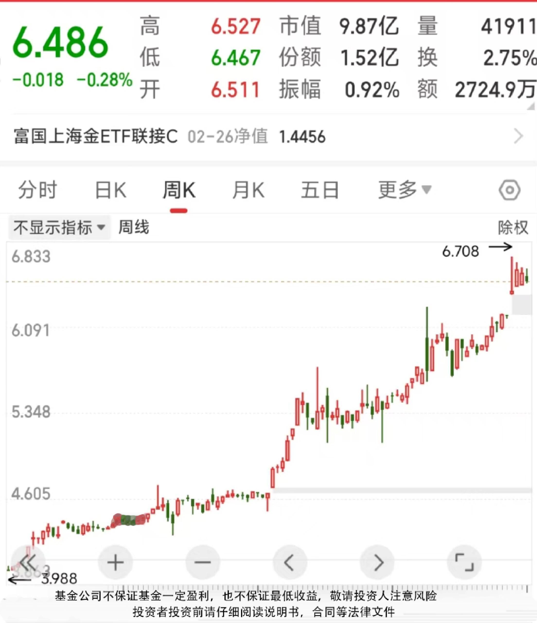 三、另一种就是选择基金,如金ETF,金ETF追踪黄金走势,追踪误差小,通过场内交易的话,600多元就能上车。也是T+0可以随买随卖,买卖十分便捷,对于目前震荡行情也是有很好的优势,比如目前在这个区间震荡,区间下沿买入,到了区间上沿即可卖出,既不会错过行情,也不会受到高额手续费困扰,管理费与托管费合计仅为0.2%/年。而且富国大平台也有保障,持有更省心。