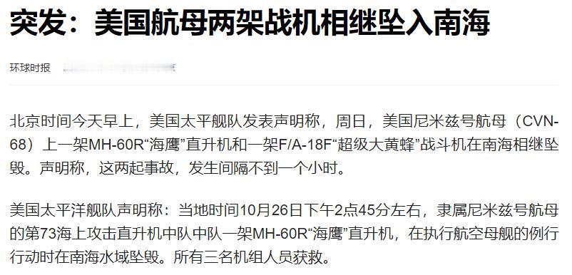 在10月26日的南海坠海事件中,还以为是美国海军先摔F-18舰载机,然后起直升机捞人结果直升机也摔了,没想到是先摔直升机。这场连环事故把"尼米兹"号航母的谢幕之旅搅成了一场尴尬剧。 当地时间下午两点四十五分,隶属于第73直升机海上打击中队的一架海鹰直升机从"尼米兹"号甲板上起飞。当时天气还算晴朗,海风也不大,这架直升机本来要执行巡逻侦察的例行任务,螺旋桨转得呼呼响,带着一股柴油味就升了起来。 可刚离开甲板不到一公里,机身突然开始剧烈摇晃,飞行员拼了命拉杆调整,仪表盘上的警报灯闪成一片,最后还是没稳住,"噗通"一声扎进了南海。 好在飞行员反应快,立刻启动逃生装置,附近的救生艇几分钟就赶了过来,机上三名飞行员都被捞了上来,除了有点呛水受惊吓,没受啥重伤。然而航母上的人还没从直升机坠海的惊悸中缓过神,新的麻烦又来了。 直升机坠毁刚过半小时,同一艘航母上的一架超级大黄蜂战斗机又出了事。这架隶属于第22战斗攻击中队的战机刚滑跑起飞,引擎轰鸣声刚响起来没两分钟,机身就有点不对劲,像是被什么东西拽着往下沉,飞行员试着加力爬升也没用,最后只能果断按下弹射按钮。 随着两朵伞花在空中张开,战机一头栽进海里,两名飞行员落在海面上后,附近巡逻的小艇立马冲过去,又把这两人从救生筏上拉了上来,算是有惊无险。 短短一小时内接连摔掉两架军机,这事儿让美军太平洋舰队急得直跳脚,赶紧发了个声明出来。声明里就说事故原因正在调查,至于具体坠海地点、当时有没有其他船只在场这些关键信息,一个字都没提。 有意思的是,这两架飞机的价值都远超美军的A级事故标准——海鹰直升机单价差不多四千万美元,超级大黄蜂更是高达七千五百万美元,这俩宝贝疙瘩加起来的钱,在一线城市能买上百套普通商品房,换成学区房也得有几十套,就这么眼睁睁沉进了海里。 今年美军海军的事故率着实有点高。算上这两起,2025年已经发生了12起A级事故,比去年多了三起,比前年多了五起。从二月到八月,电子攻击机、隐形战斗机轮番摔,有的是训练时出事,有的是航母拦阻系统故障导致。 现在,美军在南海、亚太地区常年保持高强度战备,兵力紧张不说,人员也累得够呛。飞行员训练时间更是跟不上,年均飞行时长只有130小时左右,比200小时的标准少了近三成。 现在美军最头疼的就是查清事故原因,但明眼人都能看出点门道。军舰天天在南海"秀肌肉",机器和人都处于高压状态,不出事才怪。 接下来就看美军怎么收场了,只是这南海的风浪,恐怕一时半会儿还停不了。