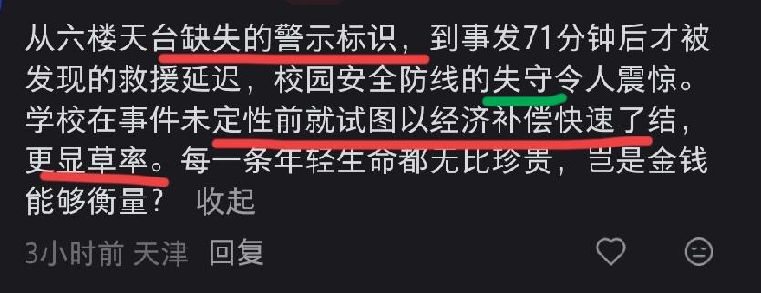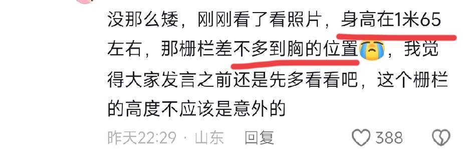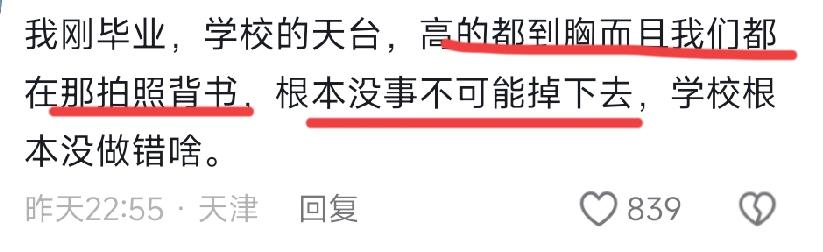 烟台理工学院女大学生坠亡这事,有一点可疑,看到好几个自称是本校学生的留评他们屋顶的栏杆高度都能到女生胸部,不太可能活动腿部就掉下去。 据说是上周三在二教六楼天台出的事,当时是下午5点多,上完课后。 家属的诉求是天台没有危险警示标语,71分钟后才被发现延误了抢救时机。 学校给出的方案是退两年学费加其他补助共10万。 家长不认可,也不相信是自己孩子有意跳下去的。 现在网友对此事也有两种态度,一方认为学校有责任,另一方认为学校比较冤,都是成年人,得为自己行为负责。