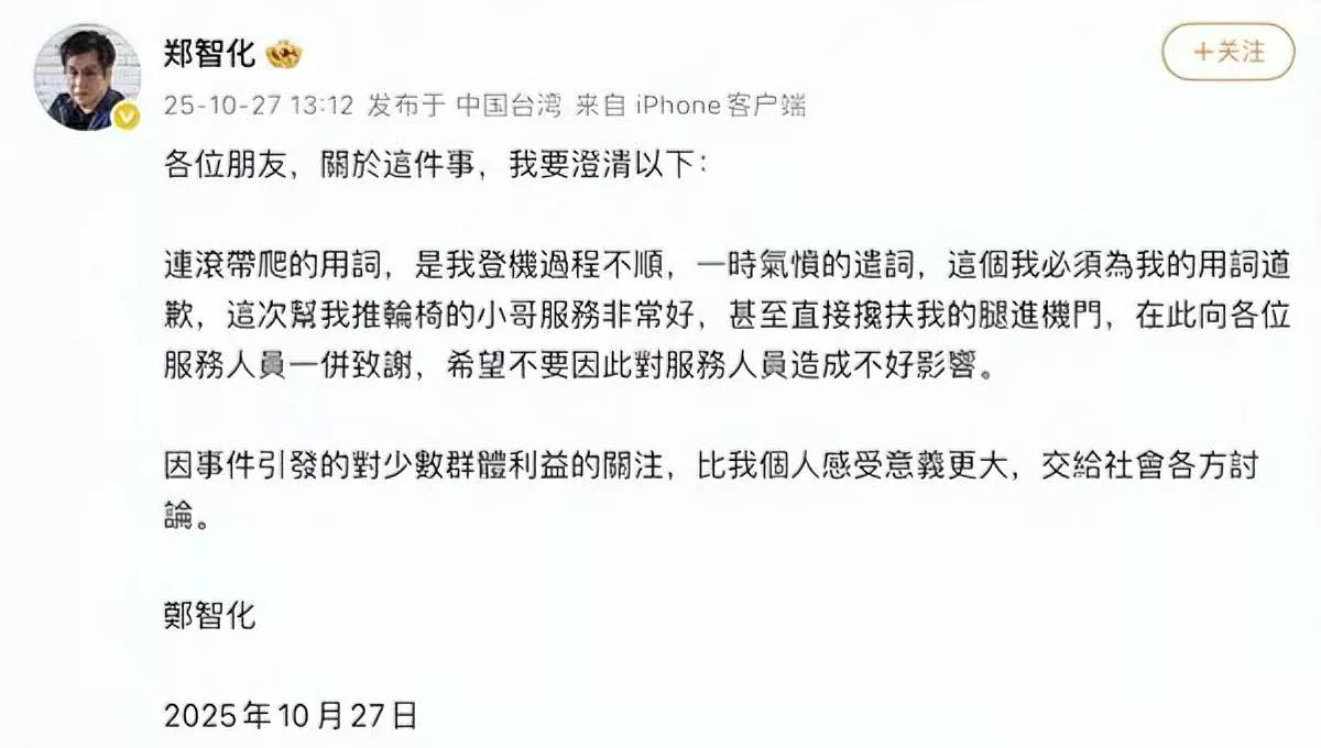 郑智化道歉了,但重点真不是“连滚带爬” 今天中午他发文说,那词儿是登机不顺时气坏了才说的,得认个错。 可更戳人的是后面——他特意提推轮椅的小哥服务特好,甚至扶着他的腿进机门,还怕这事连累服务人员,赶紧给所有人说谢谢。 其实最难得的是,他没揪着自己的“委屈”纠缠,反而把话头引到“少数群体的关注”上——这比争谁对谁错有意义多了。毕竟我们讨论这事,不是为了骂谁,是想让以后有类似需求的人,能少点“连滚带爬”的糟心啊。 你们遇到这种“情绪上头”的事时,会像他这样把焦点拉回更重要的事上吗?评论区聊聊~