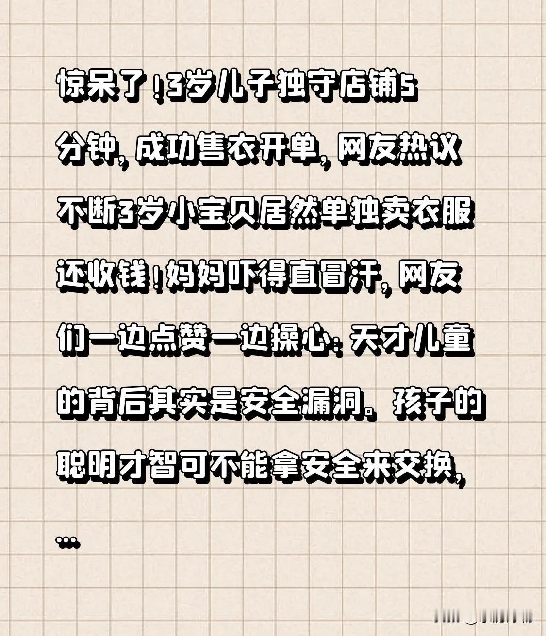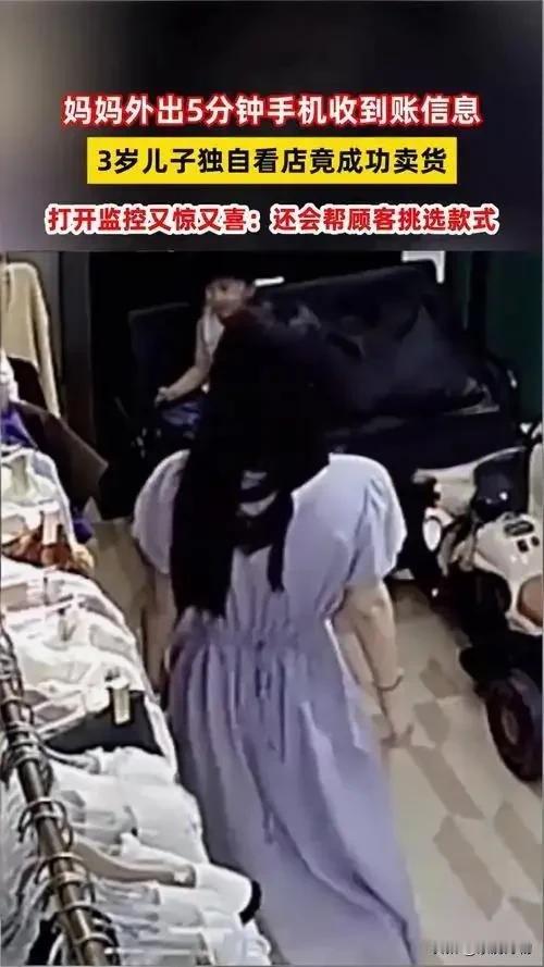 惊呆了!3岁儿子独守店铺5分钟,成功售衣开单,网友热议不断 3岁小宝贝居然单独卖衣服还收钱!妈妈吓得直冒汗,网友们一边点赞一边操心:天才儿童的背后其实是安全漏洞。孩子的聪明才智可不能拿安全来交换,父母的监护责任超级重要!育儿安全 神童现象 浙江宁波一个3岁的小萌娃,妈妈只是出门短短5分钟,他就自己当起了临时店主,把卖衣服和收钱的全套活儿都干完了。监控拍下的场景,真是让人既惊讶又觉得超级暖心~ 这小不点踮起脚尖扫码收款的样子,萌翻了整个网络,好多网友都忍不住喊出“别人家的孩子”。但开心归开心,咱们得清醒点:小孩子单独待着风险很大,万一遇到不认识的人或出点意外,那结果可就严重了。 机灵的小朋友当然该表扬,不过安全知识必须跟上。推荐家长外出时尽量把孩子带在身边,或者请信得过的邻居帮忙照看一会儿。这样既可以锻炼孩子的独立性,又能保证一切平安,实在是两全其美的选择。 亲爱的宝爸宝妈们,你们日常是怎么兼顾培养孩子独立和确保安全的呢?赶紧来评论区分享你们的育儿经验吧!宝宝买新衣服 儿童穿衣 3岁女童穿搭 男童清仓