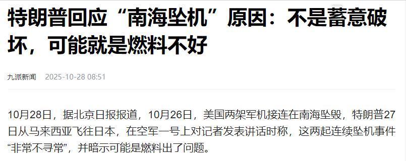 特朗普给美军坠机定调:不是人为因素,可能是用了“劣质燃油”! 当地时间10月27日,正乘坐“空军一号”飞往东京的美国总统特朗普,在飞机上接受了随行记者的追问,对近期美军两架舰载机在南海坠机的事作出回应。 让人意外的是,他直接跳过了还在紧张调查中的军方程序,一口给事故定了这个调,这番操作自然引发了各界的广泛讨论。 要知道,在特朗普表态之前,美军已经就这起坠机事件发过声明,明确说事故原因还在全面调查,现在啥结论都没出来。 但特朗普面对记者提问时,先是强调“这事儿不是人为搞出来的,也没什么好藏着掖着的”,接着话锋一转,给出了自己的判断——坠机很可能是因为战机加了劣质燃油。 这种说法和美军官方之前小心翼翼的态度完全不一样,原本大家都在关注事故本身有多严重,现在焦点全都转到了官方表态为啥会差这么多上。 其实明眼人都知道,美军两架舰载机在南海出事可不是小事,属于挺严重的军事安全事故。 按常理来说,这种事故的调查得特别严谨,得查战机平时的维护记录有没有问题,燃油是从哪个环节来的、质量合不合格,飞行员的操作流程对不对,还要解读飞行数据记录仪里的信息,分析现场残骸的情况,方方面面都得考虑到,不是一两天能出结果的。 美军之前发声明的时候,也是按这个常规流程来的,反复强调要客观全面地调查。 可特朗普倒好,调查结果还没影呢,就直接把“劣质燃油”这个推测抛了出来,这和以前处理同类事件的规矩完全不一样。 对于特朗普这波操作,外界不少人都觉得,他可能是想维护美军的形象。 毕竟这些年,关于美军装备老化、后勤保障不到位的说法就没断过,要是这起坠机事故最后查出来是美军内部管理或者装备本身有问题,那公众肯定会对美军的战斗力和维护水平产生更多质疑。 现在把原因推给“劣质燃油”这种外部因素,就能减少大家对军队自身能力的审视。 不过说到底,这还只是大家的猜测,底坠机的真实原因到底是什么,最终还是得等美军后续发布的正式调查结果才能确定,不过也可能根本就不会公布结果,毕竟美军显然也不想让其他人知道自己管理的疏漏。