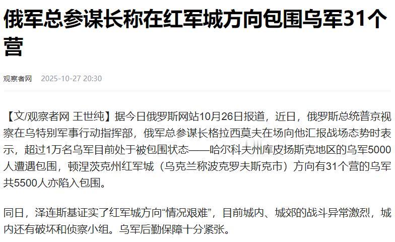 编不下去了,在普京表示”在红军城包围了约乌军31个营约5500人“之后,泽连斯基承认俄军已进入波克罗夫斯克(红军城),并称“时局维艰”。    这场仗打到现在,红军城早就成了俄乌双方死磕的“兵家必争之地”。这地方可不是普通小城,乌军在东部战场的弹药、粮食和药品补给,全得靠这儿的铁路和公路周转。   俄军今年夏天一早就盯上了这块“后勤命脉”,从顿涅茨克方向集中了坦克和机械化部队猛扑过来,硬生生在乌军防线上撕开了一道20多公里长的口子,一步步把包围圈越收越紧。   到了10月中下旬,俄军已经在红军城西部的工厂区和南部的居民区扎稳了脚跟。城里一半以上的区域都插上了俄军旗帜,士兵甚至推进到了市中心的铁路线边上,离乌军指挥部只有几公里距离。   乌军这边是真撑不住了,后勤线被掐断后,前线士兵只能靠单兵口粮凑活,重型武器的弹药也快见底,连之前修好的混凝土碉堡都被俄军的炮火轰得七零八落。   最近几天,不少乌军前线部队开始自行往后方回撤,连上级的坚守命令都等不及执行。就连一向以“硬气”著称的“亚速营”都向指挥部递交了撤退申请,可见部队士气已经跌到了谷底。   泽连斯基虽然在电视讲话里还咬着牙说“要战斗到最后一人”,但心里也清楚,这地方一旦丢了,不光东部防线会彻底崩溃,国内外那些援助他的国家也可能动摇,舆论压力能把人压垮。   而就在红军城战况胶着的时候,俄罗斯国防部长别洛乌索夫还抽空去了南部集群司令部视察。镜头里他和军官们笑着讨论战术,那轻松的神情明摆着对局势胸有成竹。   紧接着俄军又在赫尔松方向搞了波大动作,趁着夜色用冲锋舟和浮桥渡过第聂伯河,直接拿下了河中间的科拉别尔岛,乌军就算炸了附近的桥梁也没拦住俄军的脚步。   更要命的是,俄军现在不光攻坚厉害,渡河作战也玩得越来越熟练。   在第聂伯罗彼得罗夫斯克和扎波罗热的交界处,他们顶着乌军的炮火连着冲过扬丘尔河发起攻势,装甲集群往前突击的时候,乌军派出去的侦察无人机刚靠近就被防空火力打了下来,根本拦不住俄军的推进节奏。   美国那边早就看出了门道,特朗普最近在公开场合多次催促泽连斯基“赶紧跟俄罗斯坐下来谈”。毕竟现在乌军这状态,别说收复之前丢的土地,能不能守住手里剩下的阵地都悬。   红军城这仗要是彻底输了,整个俄乌战争的局势怕是真要变天,到时候美国再想帮乌军翻盘就难了。虽然目前红军城的战役还没完全结束,但战局的趋势也越来越明朗了,俄军现在已经控制了城里的关键节点,拿下整个城市只是时间问题。   而一旦红军城失守,俄军就能直接威胁到乌军的大后方第聂伯罗彼得罗夫斯克州,到时候乌军整条东部防线都得跟着动摇。   这场打了这么久的冲突,天平已经明显往俄罗斯那边倾斜了,接下来就看美西方会不会再拿出新的援助方案来帮乌军稳住局势。
