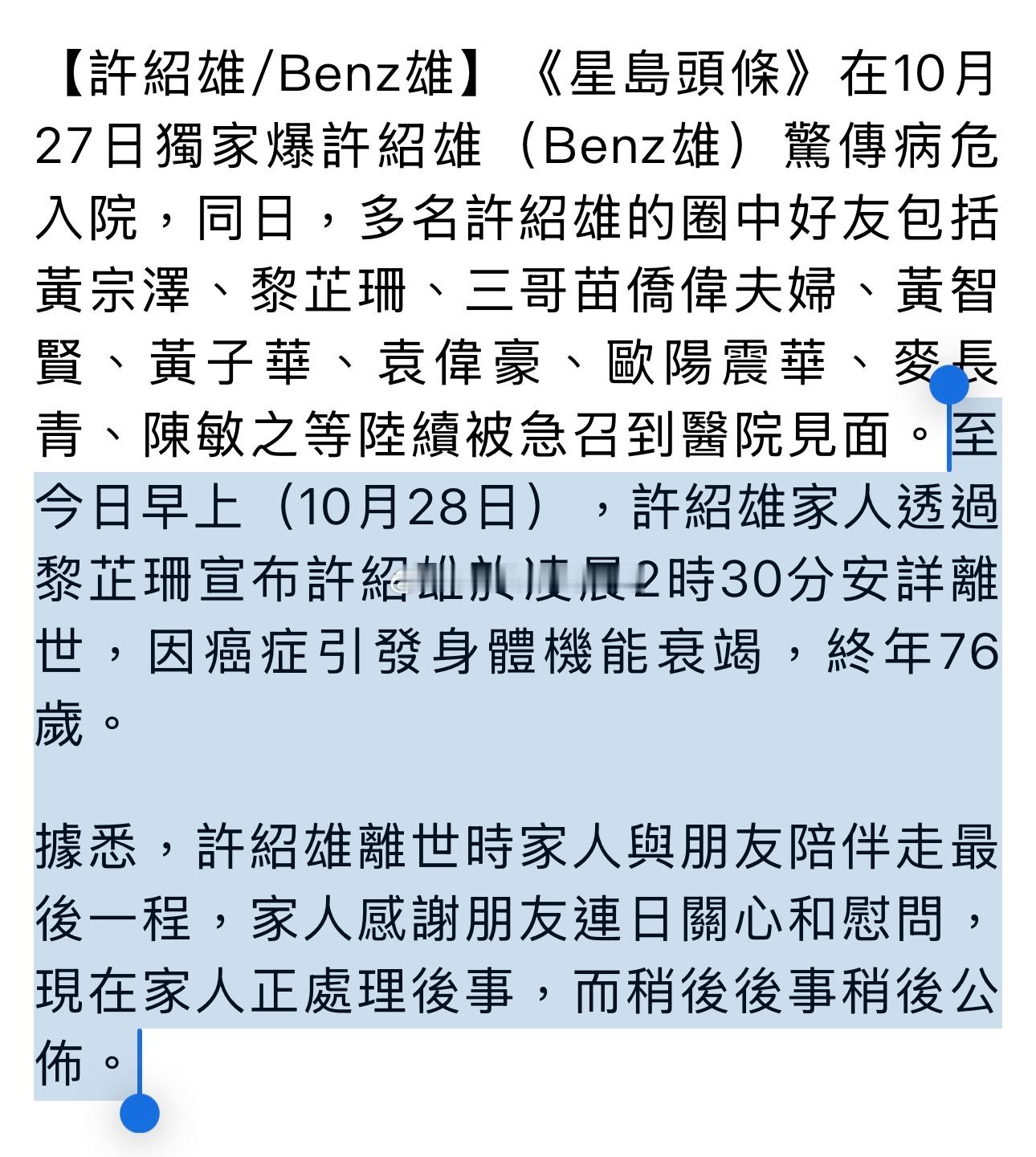 至今日早上(10月28日),许绍雄家人透过黎芷珊宣布许绍雄于凌晨2时30分安详离世,因癌症引发身体机能衰竭,终年76岁。