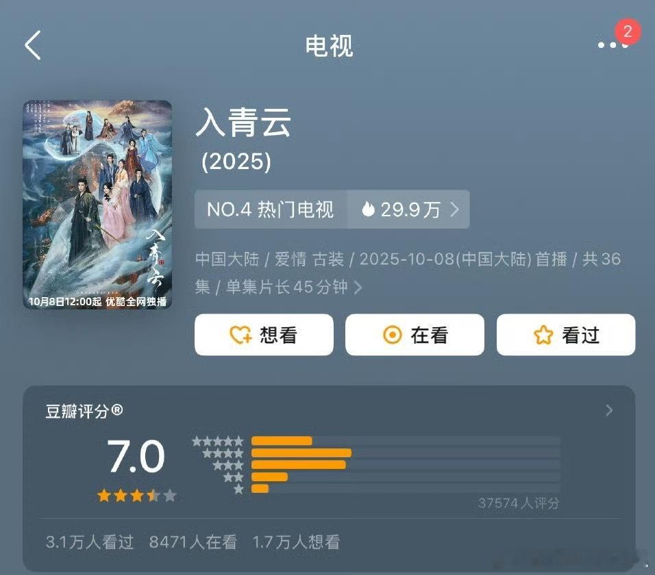 侯明昊卢昱晓《入青云》豆瓣开分7.0分,3.75万人评分