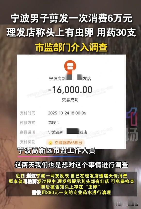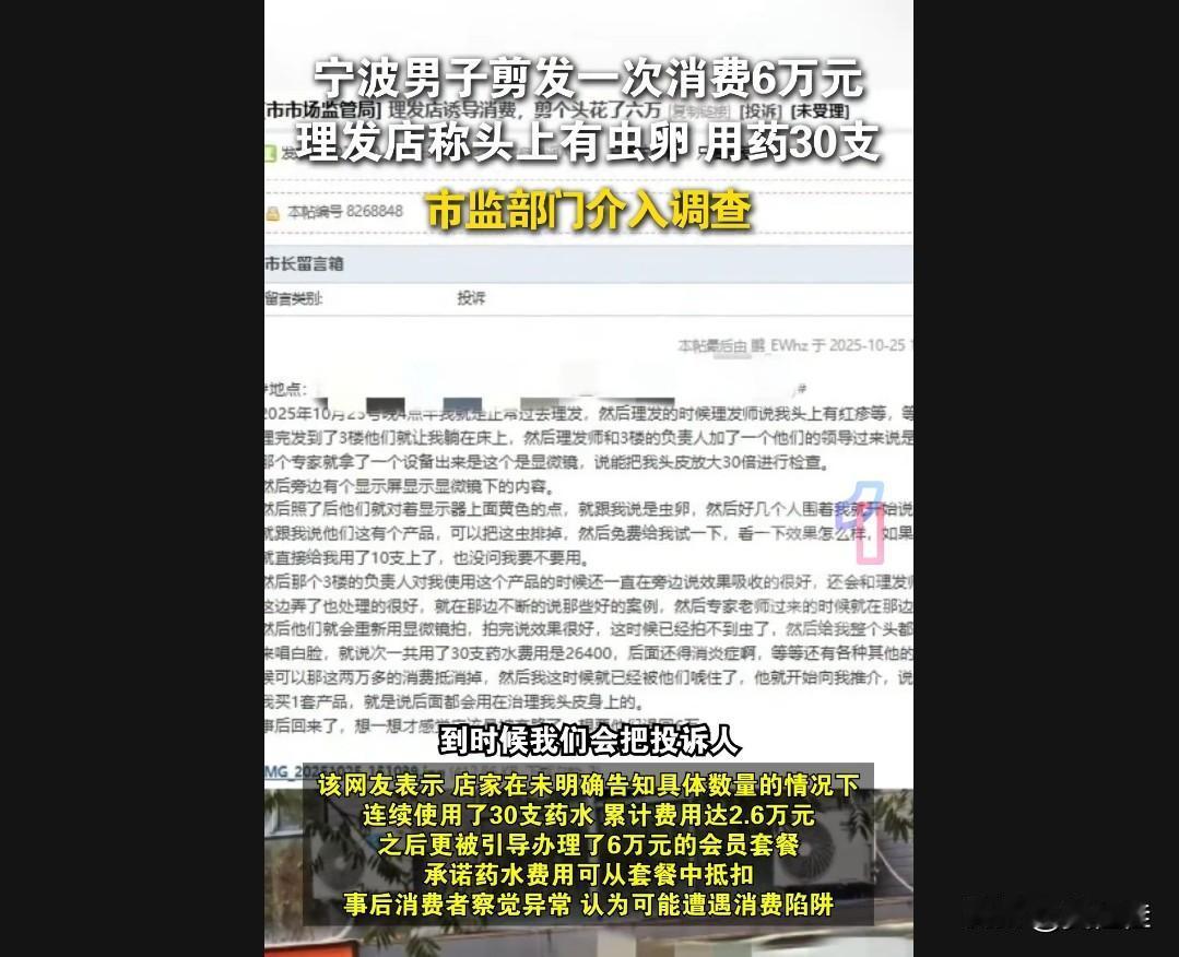 剪个头花6万!宁波这理发店是抢钱吧! 剪发时被说头上有虫卵,理发店直接用了30支880元的“药水”,还套路办了6万会员套餐,付款记录都摆在这,店员却推说不清楚。 这分明就是硬坑钱——没说清用量就猛上“药水”,再拿套餐抵费用,一套操作把人套得死死的。现在市监已经介入调查,就等把这事儿掰扯明白,把坑的钱要回来!