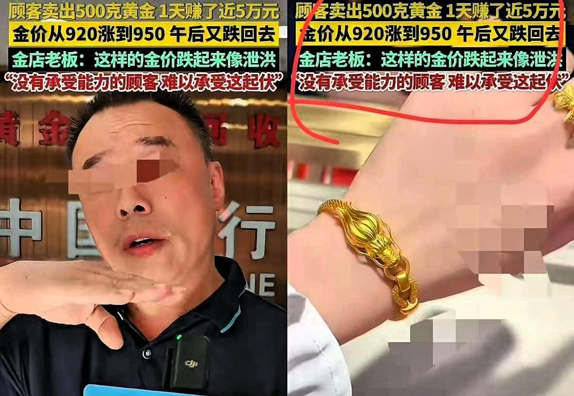 浙江杭州,顾客为了赚快钱,直接买了500克黄金,第二天就卖了,仅仅1天时间,净赚了近5万元,这事在附近传开后,不少人都挺关注。 但金店老板说,那天的金价波动其实很大,上午还是920元一克,中午涨到了950元,可到了下午又跌回了920元,起伏特别快,不是谁都能承受住这种风险的。 很多人看到有人赚钱,就跟着跟风。有位老顾客也买了200克,结果刚买完金价就开始跌,他连续三天都来店里问“涨了没”,最后因为急着用钱,只能亏了2000多块钱卖掉,临走时说以后再也不碰短期炒金了。 还有些人更犹豫,买了之后想着等金价再涨点多赚点,没成想金价反而往下走,黄金攥在手里,卖了要亏不少,留着又担心继续跌,左右为难。 其实短期炒金根本不算投资,更像是碰运气。金价受国际形势、美元走势等多种因素影响,这些都不是普通人能预判的,偶尔赚一次钱,更多是运气,不是常态。 要是真想买黄金,不如把它当作长期的资产配置,比如每年固定买个百八十克存着,主要用来抗通胀就好,别想着靠它短期赚大钱,大多数人这么做,最后都容易吃亏。 赚钱还是得踏实点,别被短期的收益冲昏头。