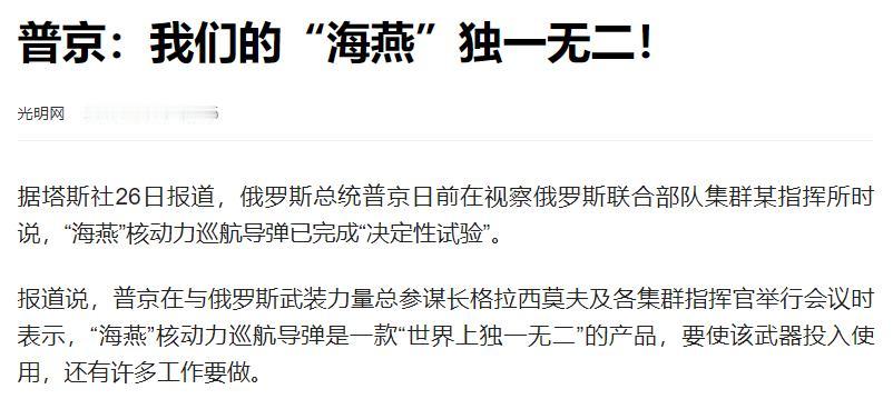 “海燕”核动力巡航导弹就是一种新式核武器!   10月26日,多家媒体报道了俄罗斯总统普京在视察联合部队集群某指挥所时的表态,他明确说这款导弹已经完成“决定性试验”,这意味着俄罗斯手里又多了一款能拿得出手的新式核武器,战略威慑的底气自然更足了。   这些年国际安全形势复杂,俄罗斯和西方在军备控制协议、地缘政治博弈等方面的分歧一直没断过,之前的核威慑体系面对新的反导技术也得升级才行。   对于俄罗斯来说,要守住自己的战略安全红线,就得有能跟其他核大国掰手腕的家伙事儿,所以新型核武器的研发从来没停过。“海燕”就是这盘大棋里的关键一环,就是想打破传统巡航导弹的性能限制,搞出一款飞得更远、更难拦、威慑力更强的撒手锏。   当然,“海燕”能走到今天这一步,背后的功夫下得可不少,也不是一天两天就能成的。而在这次决定性试验之前,俄罗斯的科研团队和军工企业前前后后做了无数次测试。   就说核动力装置小型化这个难题,科研人员得把原本庞大的核动力系统压缩到导弹能装下的尺寸,还得保证安全稳定,光是调整核心部件的参数、测试不同材料的耐受力就花了好几年。   还有飞行控制系统,得让导弹在复杂的空中环境里灵活转弯,避开对方的雷达探测和导弹拦截,测试时甚至模拟过各种恶劣天气和电子干扰场景。   现在普京说完成了决定性试验,意思就是这些关键难题都解决得差不多了,导弹的核心性能都达标了,离真正装备部队就差最后的流程了。   而作为核动力巡航导弹,它最厉害的地方就是用核动力驱动,这比传统的常规燃料导弹飞得远多了,在空中飞个几千公里都不是问题,还能绕着复杂路线走,对方的反导系统想拦都难,这种突防能力可不是一般导弹能比的。   等“海燕”真正列装后,俄罗斯的核力量库里又多了一个硬角色,不光核威慑的手段更丰富了,实战威慑力也会跟着提升,这对全球战略平衡肯定会有影响。   不过这事儿也给各国提了个醒,现在新型武器技术更新这么快,光靠搞军备竞赛不是办法,任何事最好还是坐下来好好谈,通过对话协商制定规则,才能让全球战略安全更稳当。   毕竟大家都清楚,真要是在核武器上较起真来,没有谁能真正占便宜,和平稳定才是所有人都希望看到的。