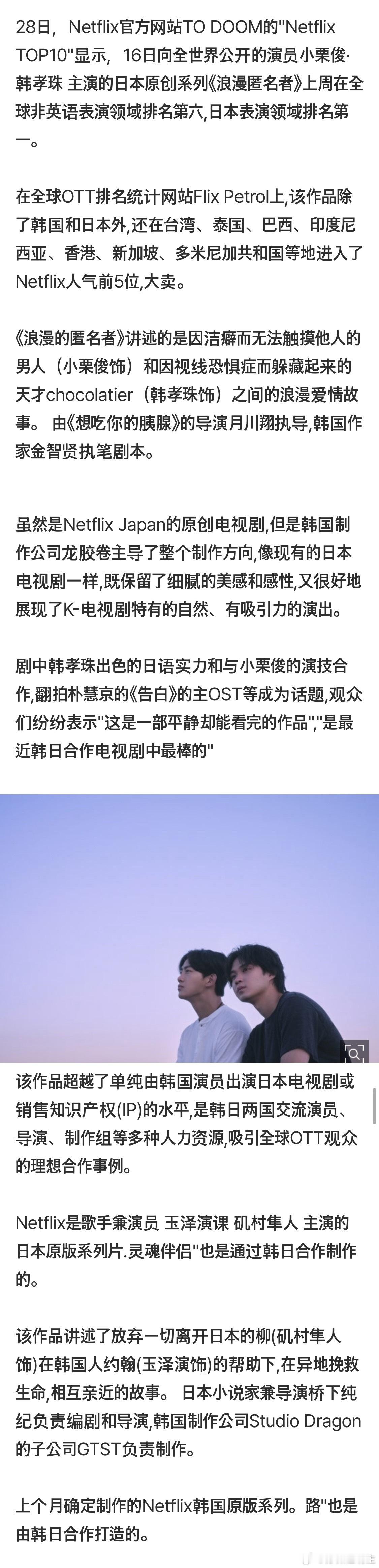 28日网飞TOP10显示,16日向全世界公开的演员小栗旬韩孝周主演的日本原创系列《浪漫匿名者》上周在全球非英语表演领域排名第六,日本领域排名第一。