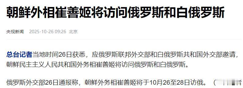 朝俄关系要更进一步了! 朝鲜中央通讯社放出消息:应俄罗斯联邦外交部和白俄罗斯共和国外交部的正式邀请,朝鲜外务相崔善姬已经确定在10月26日出访这两个国家。 其实熟悉情况的人都知道,朝俄这两年关系一直处得不错,高层之间没少碰面交流,不管是政治上的相互支持,还是经济、文化领域的合作,都在稳稳当当往前推进。 就拿去年来说,两国还举行过好几次视频会晤,聊的都是怎么把合作搞得更实在。而这次崔善姬外务相出访,正是在这种友好氛围下的一次重要外交安排。 据说双方外交部门早在一个多月前就开始对接细节,从行程安排到会谈议题,都反复沟通确认过,这足以看出两国对这次互动有多重视。 按照官方公布的信息,崔善姬外务相这次要跑两个国家,先去俄罗斯,再到白俄罗斯。到了俄罗斯之后,她会和俄罗斯外交部的官员坐下来好好谈,不仅要聊两国之间的合作事儿,像地区安全、国际形势这些大家都关心的话题,也会深入交换想法。 虽然具体要谈哪些细则还没对外公布,但想来也都能猜的到,肯定少不了怎么进一步加强经贸合作,比如在能源、农业这些互补性强的领域再找些新机会,另外在国际舞台上怎么互相配合,也是重点要聊的内容。 毕竟现在国际上不确定的因素不少,作为传统友好国家,朝俄确实需要多沟通、多协作。而对崔善姬外务相来说,这次出访也是她近期外交工作的重头戏。 这两年朝鲜在外交上一直挺主动,而俄罗斯作为重要合作伙伴,自然是重点交往对象。从现实需求来看,朝俄两国确实有不少共同的挑战,也有很多合作机遇。 比如俄罗斯在能源和工业技术上有优势,朝鲜则在劳动力和部分农产品上有特点,双方合作起来能互相补台。而且在一些国际问题上,两国的看法也比较相近,经常能在联合国等场合互相支持,这些都是两国能把合作越做越深的基础。 这次访问把白俄罗斯也加进来,其实也挺有讲究的。 白俄罗斯和俄罗斯关系密切,同时也跟朝鲜保持着传统友好,三国之间多走动走动,不仅能各自拓展合作空间,还能在地区事务上形成更多共识。 总的来说,崔善姬外务相这次出访俄罗斯和白俄罗斯,绝对是朝俄关系发展中的一个关键节点。它不只是一次简单的外交访问,更是两国巩固友谊、深化合作的实际行动。