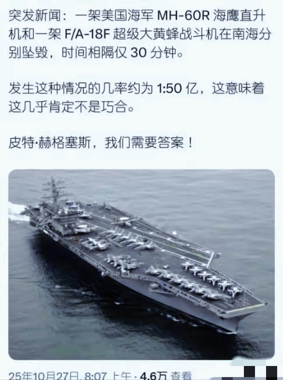 美机南海双坠,美媒甩锅中国引嘲讽 美军“尼米兹号”航母打击群在南海发生两架战机同时坠毁事故,美媒以“概率仅1:50亿”为由抛出“阴谋论”,无证据指责中国“神秘武器”是元凶,还施压美国战争部长解释。 事实上,美军在南海频繁开展高强度军事活动,战机超负荷运行、维护不足及飞行员压力大,才是事故大概率成因。这不过是美国借抹黑中国转移国内指责的霸权操作,中国外交部已严厉驳斥无端指责。 中外网友纷纷调侃嘲讽美媒荒谬逻辑,美国国内军事专家也指出事故源于美军自身问题。美国纵容此类抹黑,只会加剧国际孤立,这场闹剧终将沦为霸权笑柄。