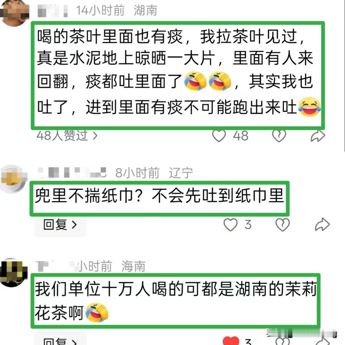 不止有老“痰”酸菜,还有老“痰”茶叶! 辽宁兴城,因为工作人员的一口痰,整个池子里的酸菜都白费了,你说你干活就好好干活,又抽烟又吐痰的,那你去外面抽、去外面吐不行吗?非得在里面吐,这下被人拍到了吧。不仅自己工厂要受罚,还有可能连累整个兴城的酸菜厂。 这边老“痰”酸菜的影响还没有结束,就有一位湖南的朋友曝出,自己曾经在茶叶厂工作过,一大片茶叶晾晒在地上,需要工人来回翻,出去一趟太麻烦了,不可能出去吐完再回来的,所以也会把痰吐在茶叶里面。 此话一出,很多网友坐不住了,有网友直言:我们家这几年喝的都是湖南的茉莉花茶,你这让我以后还怎么喝啊! 其实这些只是我们看到的,我们没看到的可能还有更多。有句话说的好,当一件事情被曝出来的时候,说明它已经存在很长时间了!酸菜 泡酸菜 往酸菜池里扔烟头的人呢?
