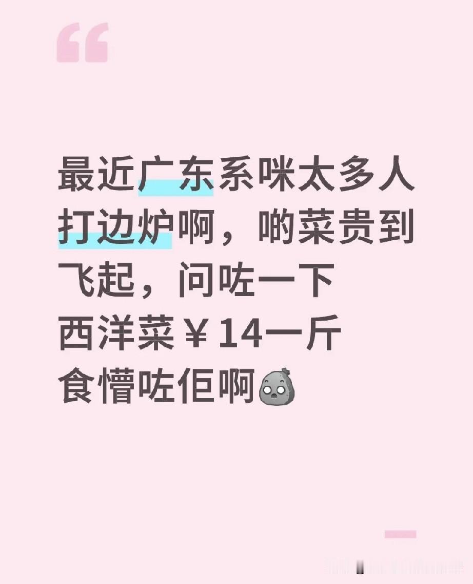 广东人打边炉把西洋菜吃成轻奢菜! 广东人最近是集体迷上打边炉了吧?西洋菜直接飙到20元一斤,这价格把广东食客看懵了:“吃个火锅,连青菜都快吃不起了!” 打开外卖平台一看,西洋菜价格参差不齐,有的甚至快赶上肉价了。 有人吐槽:“打边炉自由没了,连青菜都要精打细算!” 但也有人说:“新鲜食材贵点正常,为了这口鲜值得!” 你觉得广东这波菜价暴涨,是打边炉惹的祸,还是另有原因?