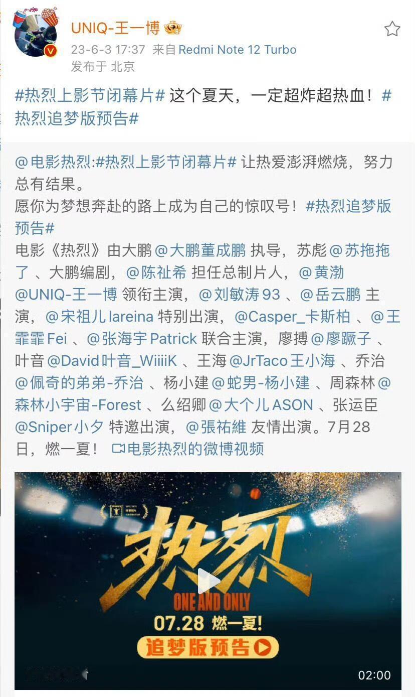 王一博《气势如虹》播放量破亿,其实王一博的破亿播放又何止一个两个?舞台、影视视频、正能量红歌连广告都破亿! 正能量红歌都能破亿9大出圈,难怪十五运会组委会如此兴奋[捂脸]。 不完全统计王一博起码15个破亿播放量了(欢迎补充)。 王一博