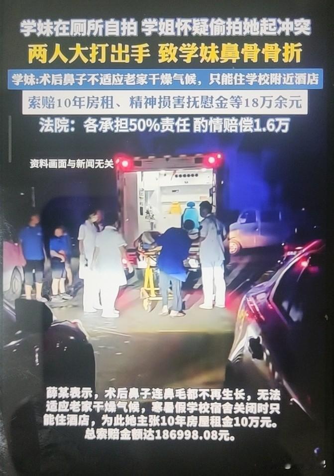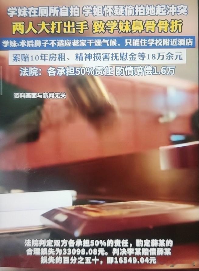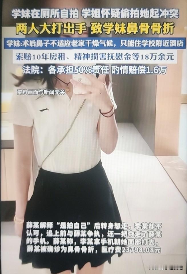 当偷拍的风刮到女生和女生之间会发生什么? 上海某学院举办了运动会,人非常多,非常热闹,同学们都很开心,有很多同学报名参加了运动会,想着一展身手。 可是就是这么热闹的一天,却发生了一件让所有人都没有想到的事情。 就在运动会当天,薛某(化名)陪着同学去体育场的卫生间换衣服,同学去换衣服了,薛某等的无聊,就拿起手机对着镜子自拍。 可是,就是这么巧,这一幕被同样来卫生间换衣服的高年级学姐(李某,化名)看到了,李某就以为薛某在偷拍自己。 于是就上前阻止,并质问薛某。薛某也很无奈,解释到“是在自拍”然后就转身想走。 学姐李某并不认可这个说法,追上薛某后与其发生了争执,还一把抢走了薛某的手机。 并拿起手机向着薛某的脸上砸去,薛某被打的鼻骨骨折,之后薛某被送往医院,光治疗费就花了23798.08元。 这事到这里就魔幻的,具体怎么争执的咱不知道,到最后竟然动手了,就挺难以理解的。 而且还有更有意思的,薛某不是被打了嘛。 薛某表示,做完手术后鼻毛都不再生长了,无法适应老家那干燥的气候,寒暑假的时候,又不能住宿舍,只能去酒店住了。 为此她想索赔10年的房租,共10万元,然后再加上其他的一些赔偿,共计186998.08元。 然而法院并没有认同她,法院判的是双方各承担50%的责任,并酌定薛某的合理损失是33098.08元。各占一半的话,也就是李某要赔薛某16549.04元。 说真的,这本来就是一件小事,解释清楚就行了,实在不行找一个老师,做一下见证也行,千不该万不该动手打人啊。 而且,后来要求赔偿也是吓人。 只能说,当时双方要是都和和气气的,哪能会出这档子事。 来源:海报新闻