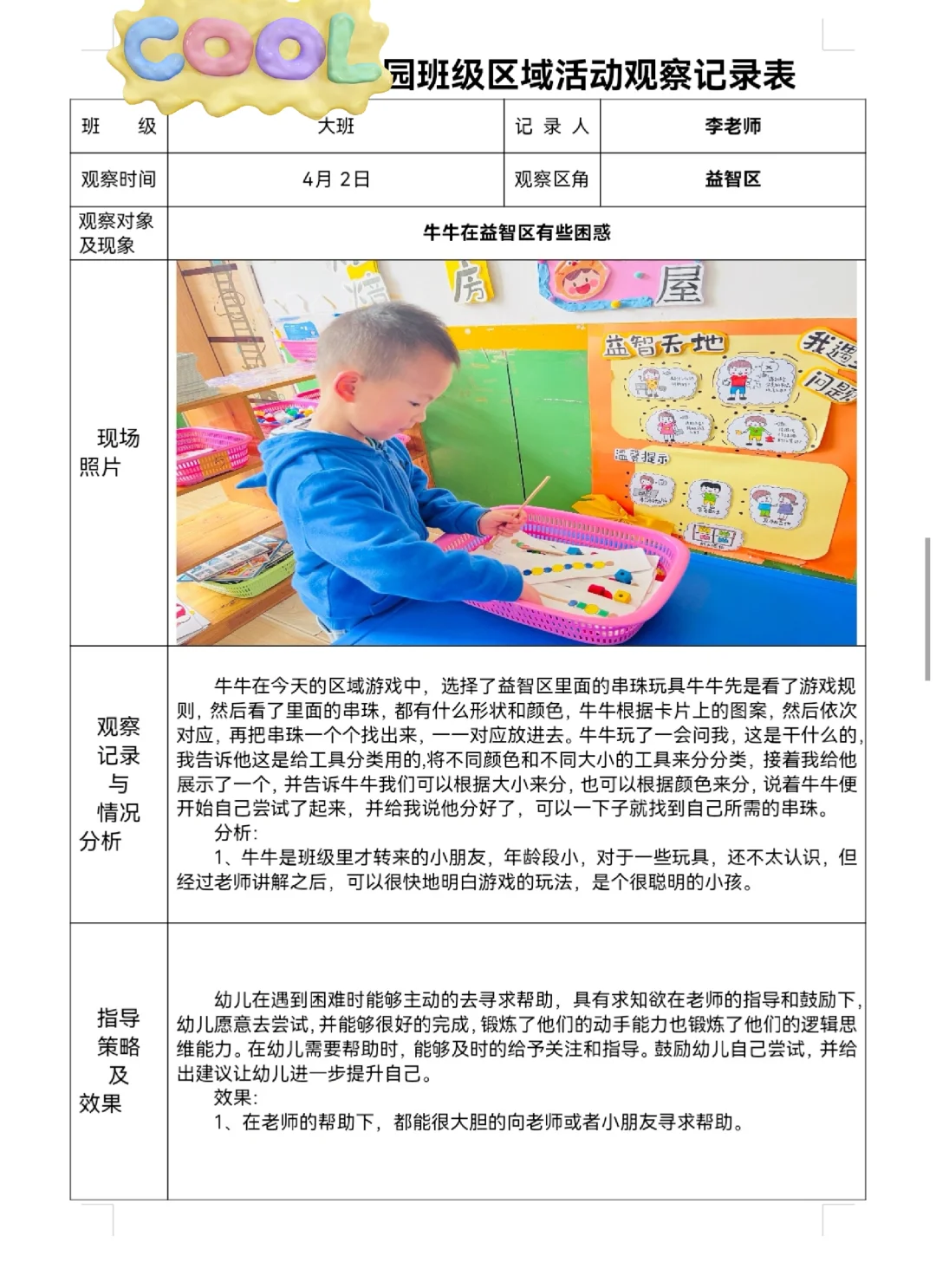 幼儿园区域观察记录表!