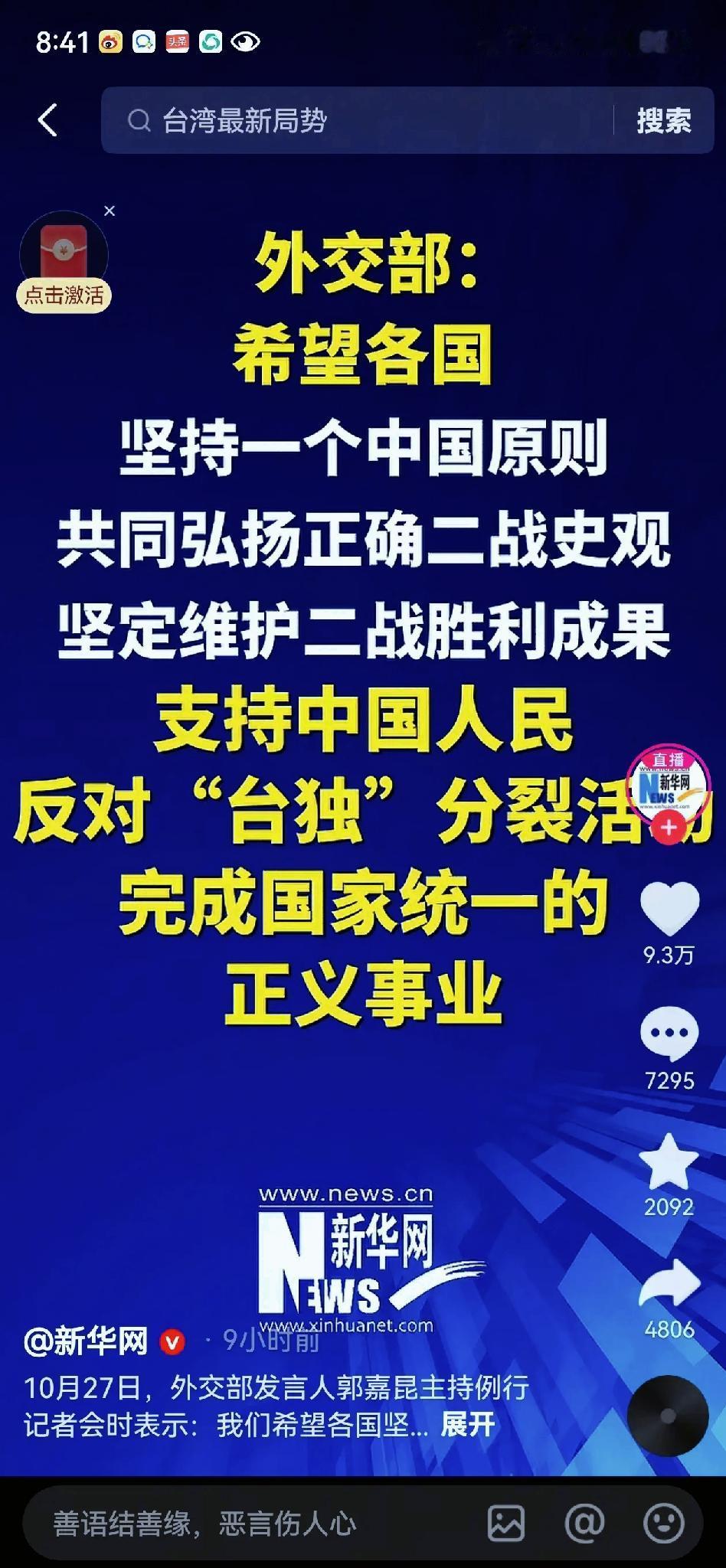 第一记,惊天动地的九三阅兵,彰显大国底气与统一决心; 第二记,惊世骇俗的《沉默的荣耀》热播,唤醒民族记忆与家国情怀; 第三记,惊为天人的台湾光复纪念日官宣,锚定历史法理与主权归属; 第四记,惊心动魄的围岛军演,亮出捍卫领土完整的硬实力; 第五记,惊涛骇浪的外交部严正申明,向世界传递不可撼动的主权立场! 懂的都懂,这一套组合拳拳拳到肉,清晰传递出促统步伐正在加速的强烈信号。台湾回归祖国怀抱,已是民心所向、大势所趋,离这一天不会太远了!不信?咱们拭目以待!