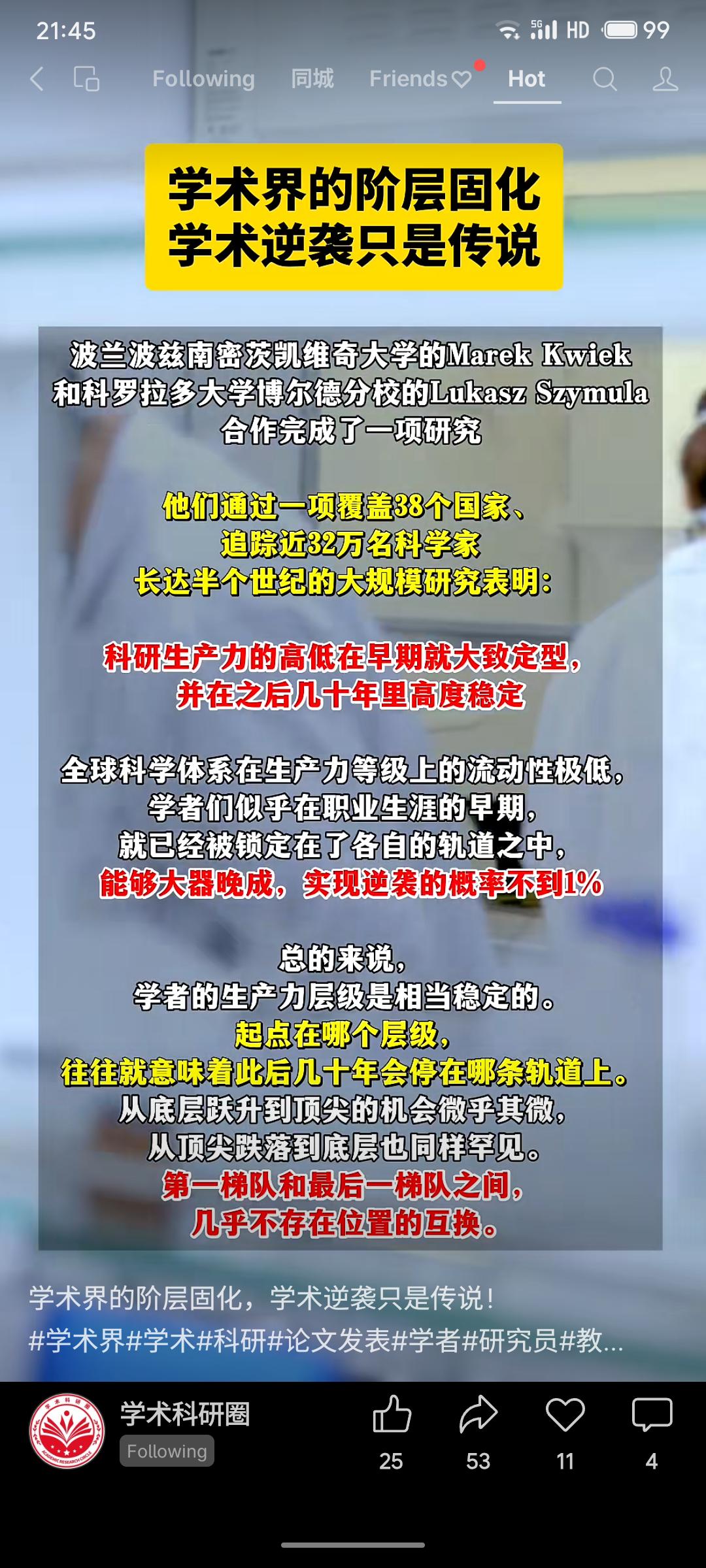 一项覆盖33个国家、追踪近32万名科学家半个世纪的研究表明:科研人员的生产力在职业生涯早期便基本定型,且几十年内高度稳定。学术阶层流动性极低,实现逆袭的概率不足1%,起点往往决定终身轨迹。