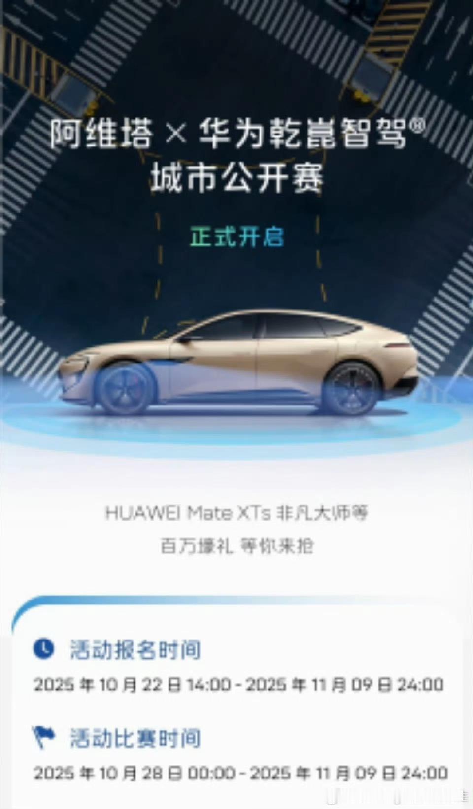阿维塔x华为乾崑智驾搞了个城市智驾公开赛,准备邀请广大阿维塔车主参加,让车主来传播一下华为智驾水平如何。 具体比赛时间是10.28-11.09,如果表现好或者发的足够多,还有奖品。 让车主来传播确实是的不错的主意,能够激发车主的参与感,车主就是最好的口碑,对于品牌形象来说是好事。 【来自懂车帝车友圈】