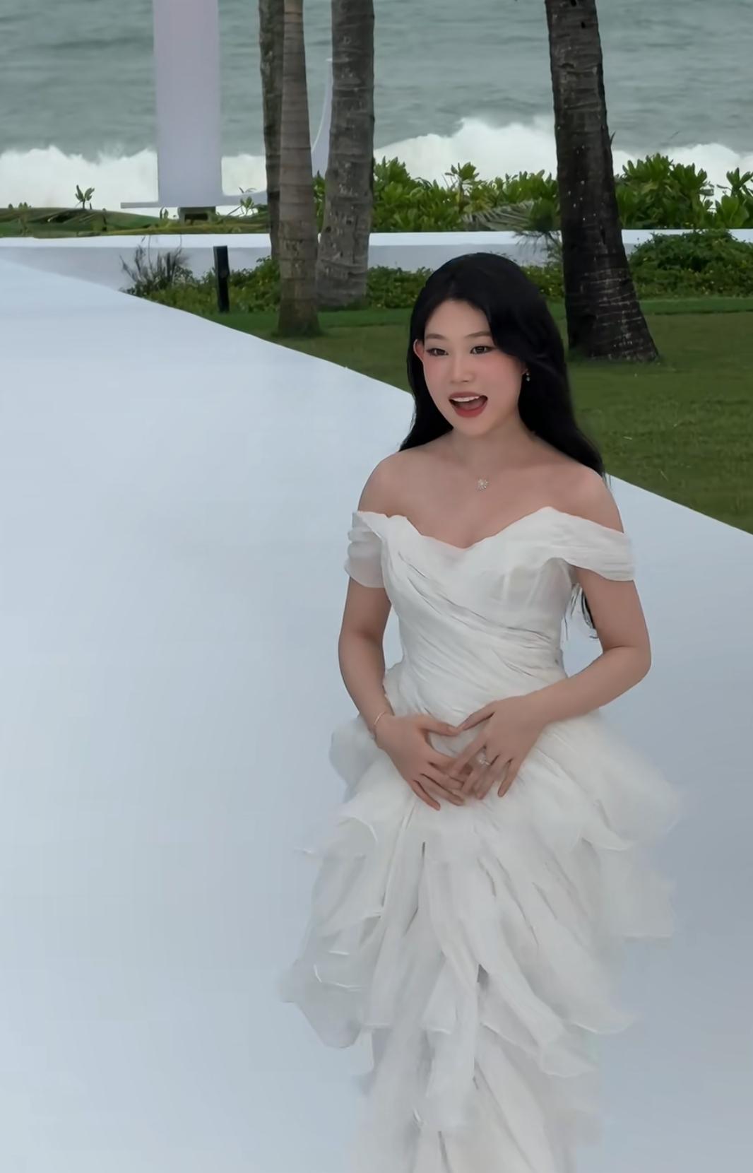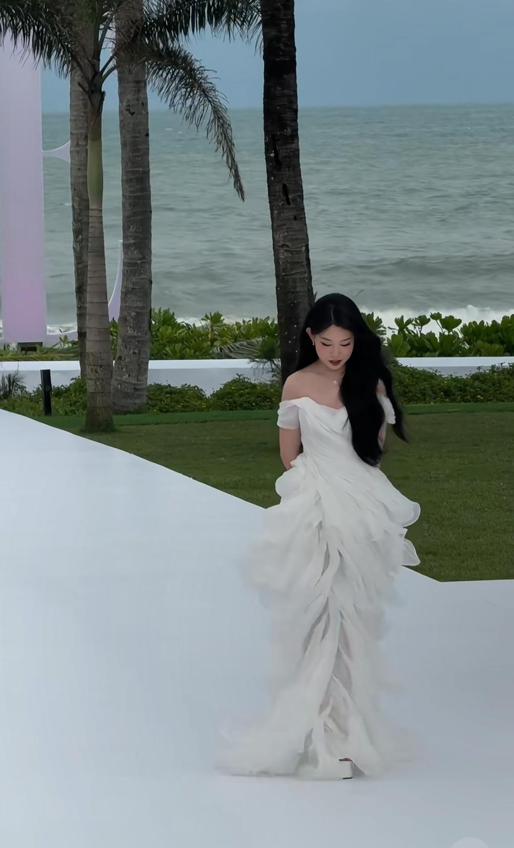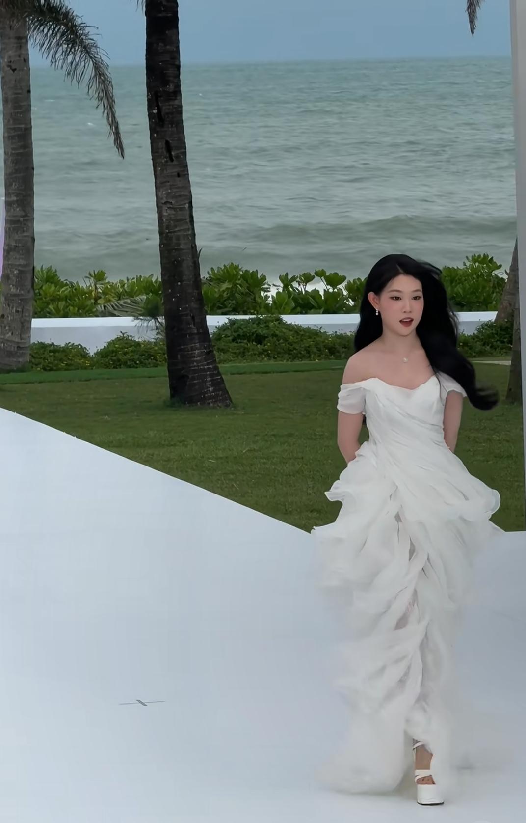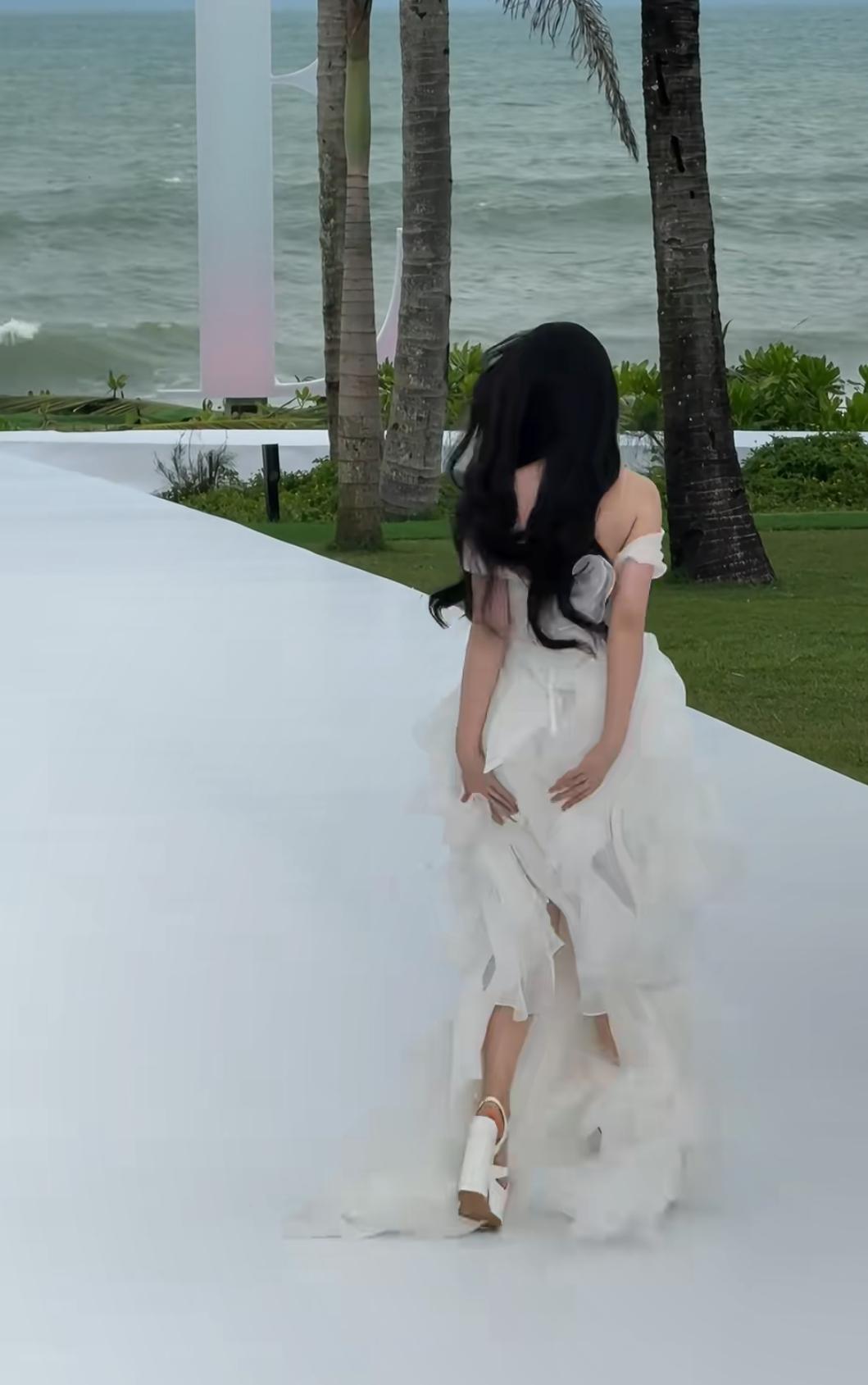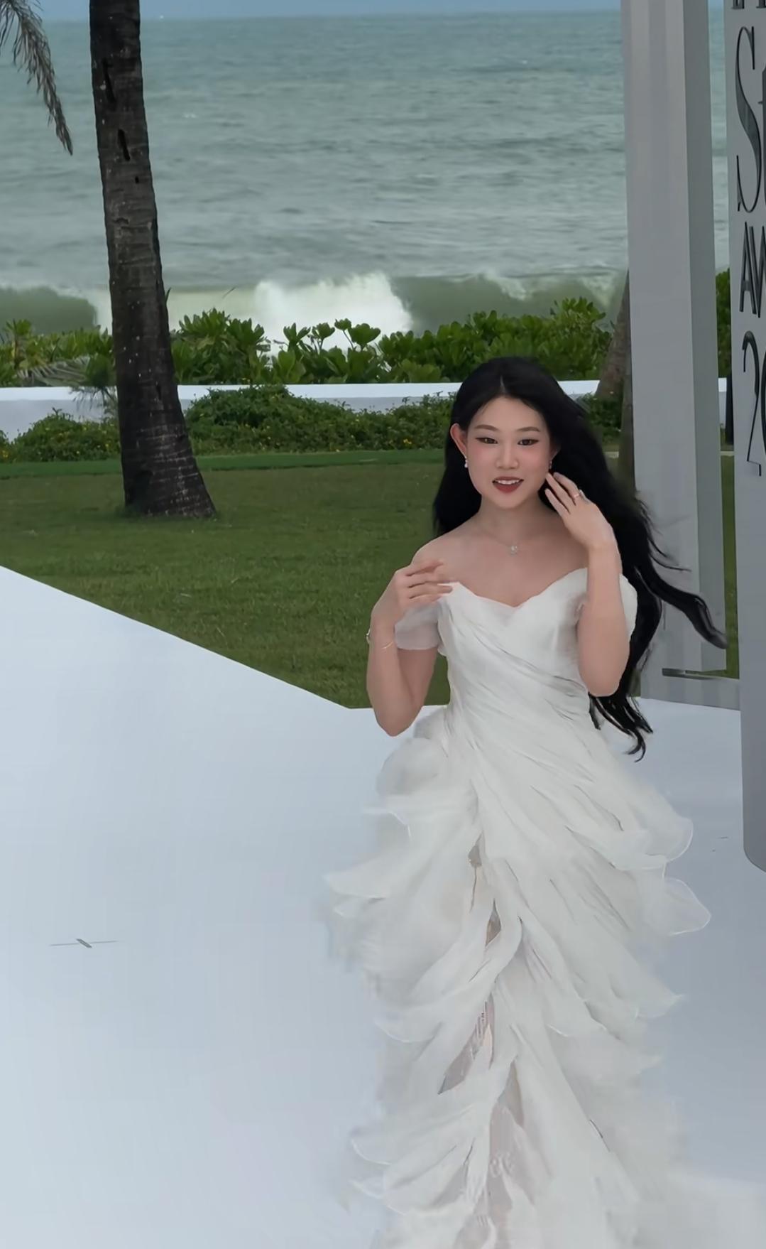 沈佳润的海边红毯:是怯生生的甜,也是没藏住的慌 沈佳润这身白裙一出场,像把海边的雾揉进了纱里,层叠裙摆飘起来全是少女感,唯独那双恨天高太“扎眼”,每步都带着点“怕崴脚”的慌乱。 她走红毯时有点慌乱、含胸的小姿态,全是没藏住的紧张,笑起来露着牙,听着主持人安排小跑,把“国民女儿”的乖乖感揣得很实。 或许她确实没太适应红毯的节奏,可这份没被打磨过的生涩,反而比完美的体态更讨喜,是和别人都不一样的松弛可爱。