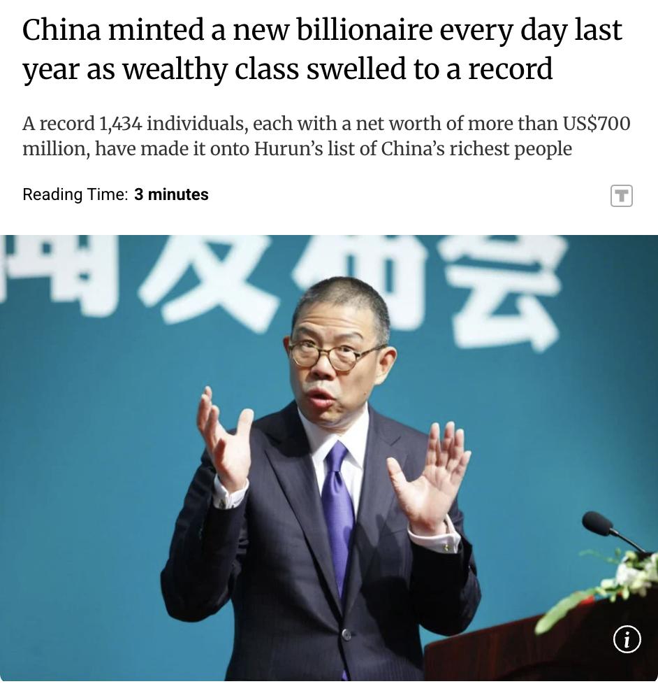 外媒:胡润研究院发布的最新《中国富豪榜》显示,受股市牛市推动,中国去年平均每天诞生一位新亿万富翁。共有1434人财富超过50亿元人民币(约7.02亿美元),创历史新高,比去年增加340人,增幅达31%。这些富豪总财富达30万亿元人民币,同比增长42%。 农夫山泉创始人钟睒睒以5300亿元财富(增长56%)重夺榜首,这是他第四次登顶。字节跳动创始人张一鸣财富增至4700亿元(涨34%),位列第二。 报告指出,新经济领域领导者是财富增长的最大受益者。