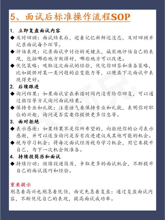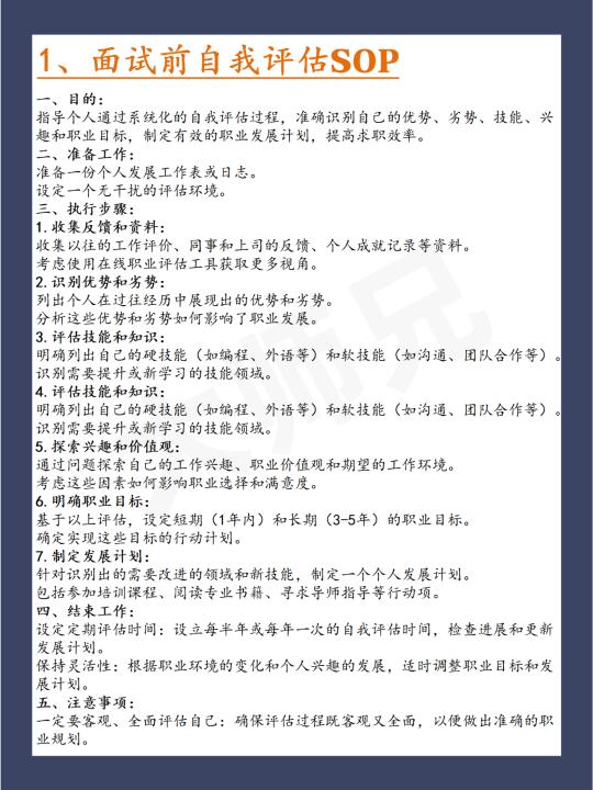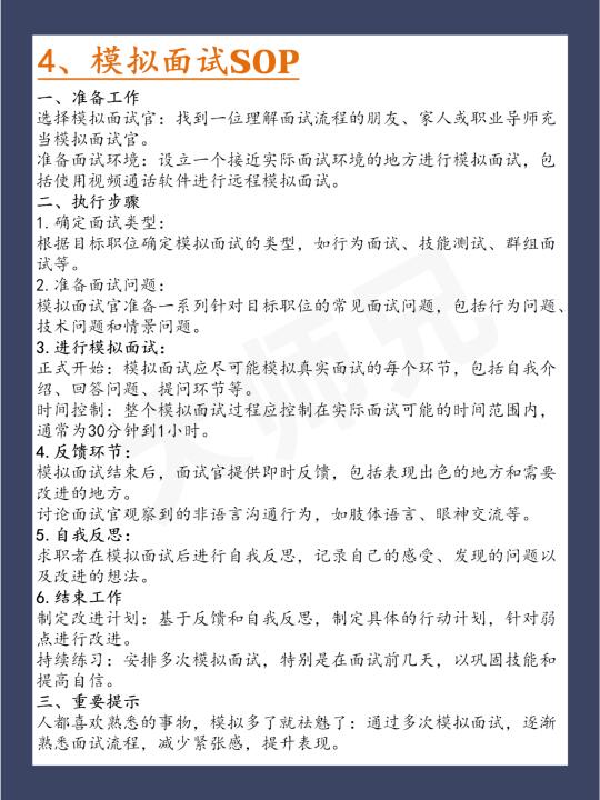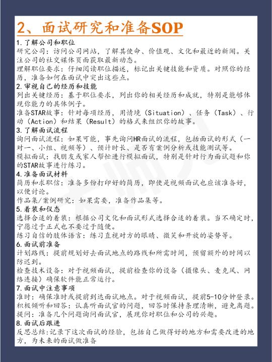 面试SOP是一套系统化、标准化的操作流程,旨在帮助求职者从准备到面试结束的每一个环节都做到心中有数、应对自如。通过遵循这套SOP,你可以大大提高面试的成功率。