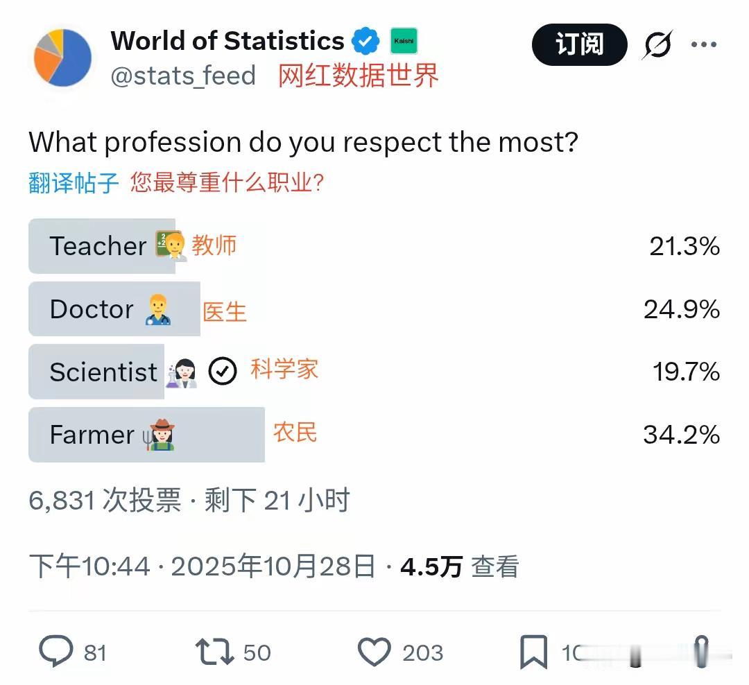 万万没想到,这才是真正的普世价值。马斯洛的需求理论再一次大显神威,全世界人民都一样。 谁能让自己吃饱饭就尊重谁? 谁能让自己活命就尊重谁? 有了这些然后谁教给自己生存技能知识就尊重谁? 然后才会想去尊重为人类作出贡献的科学家。 在这个中间似乎没有作家这个选项,如果有作家的话,大家觉得会排第几? 吃煤块长大的人肯定不会尊重农民,因为他认为他是天生地养,一切都是理所当然的,不关别人的事。 经济基础决定上层建筑。 这话真没错。 点右上角关注我,我们一起去看这个魔幻的世界