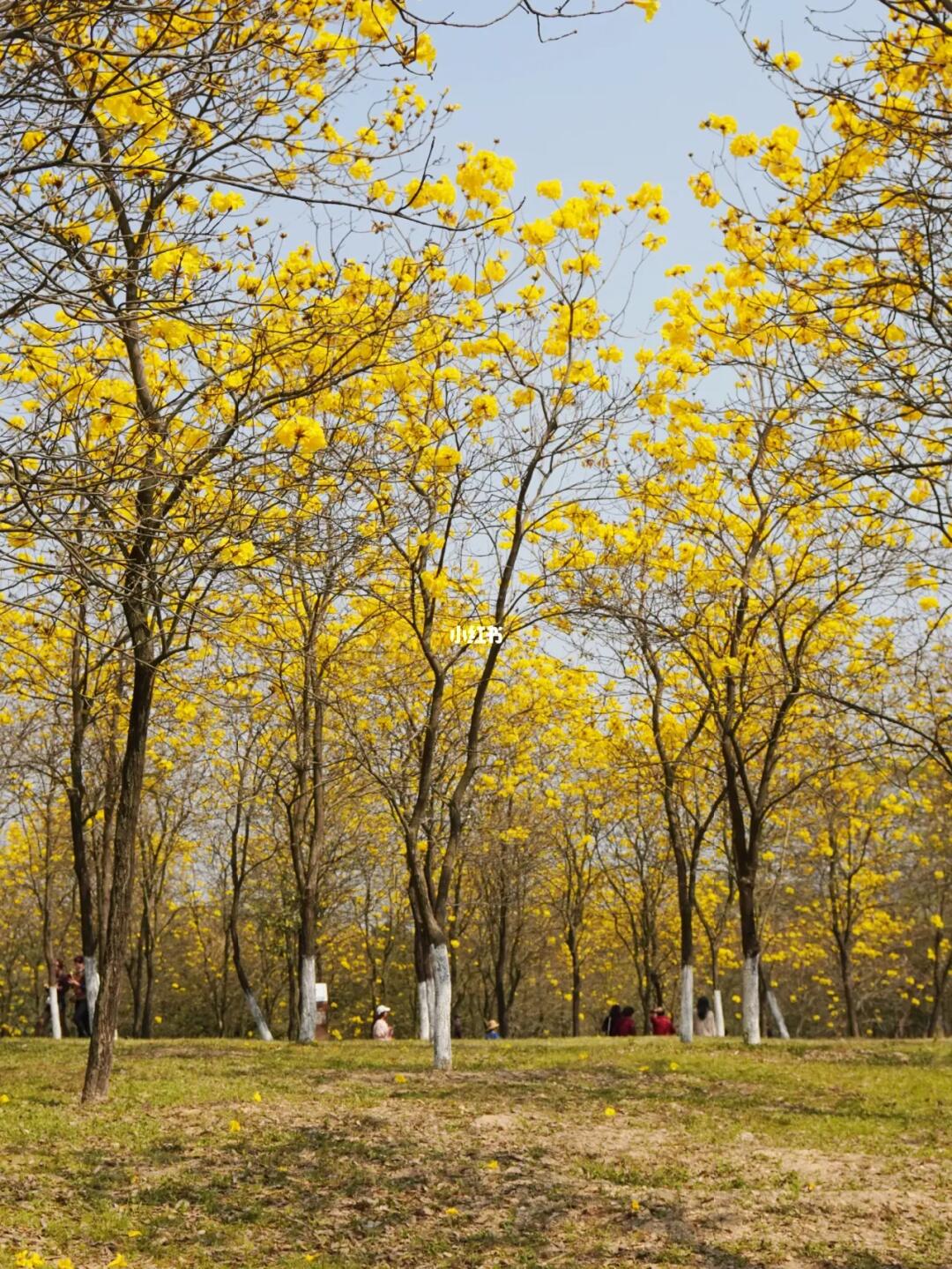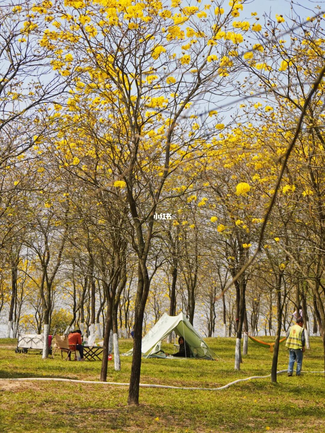 1⃣️黄花风铃木林非常大,又靠近湖边,适合露营野餐,能搭帐篷天幕。