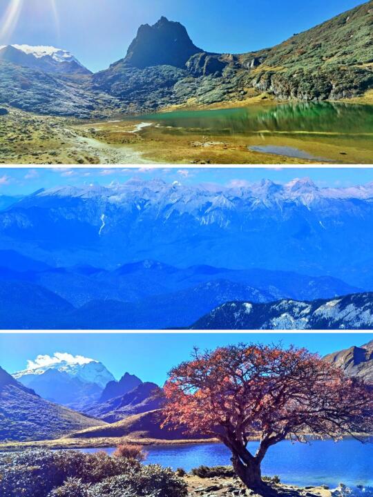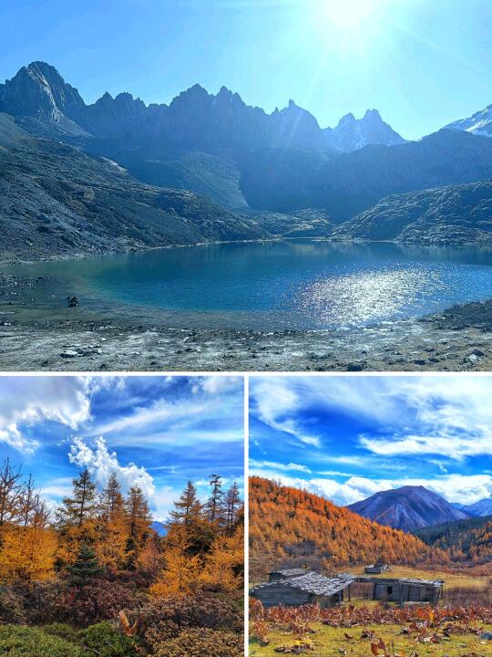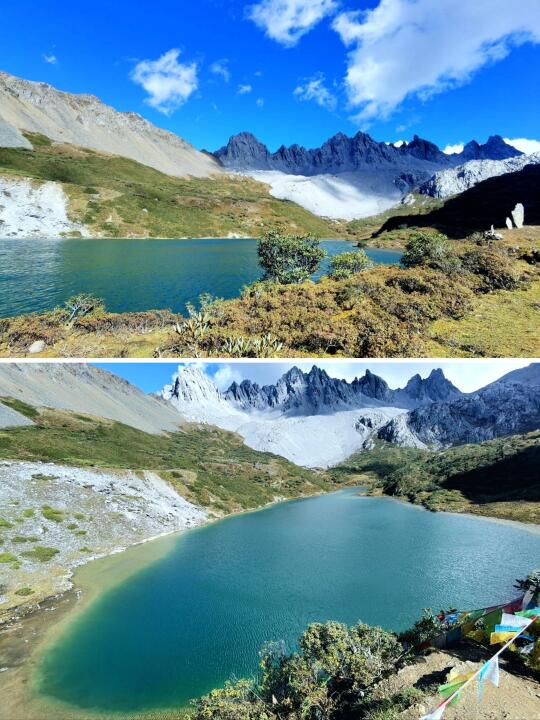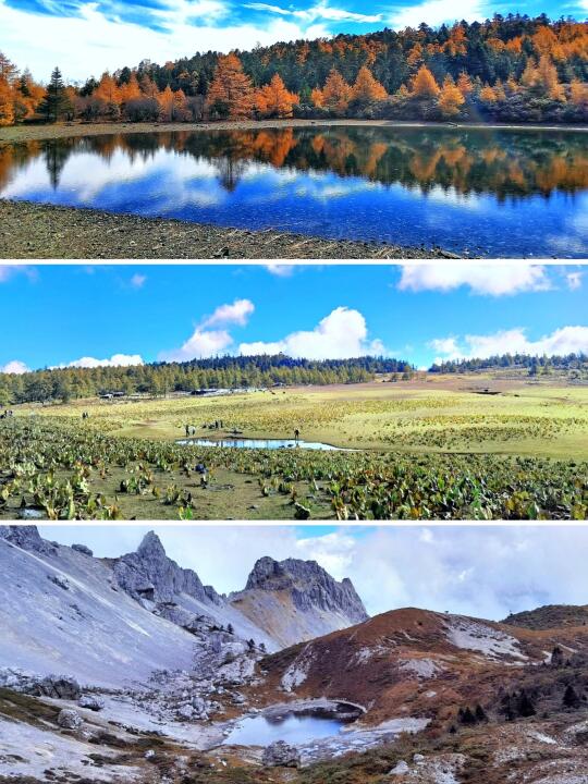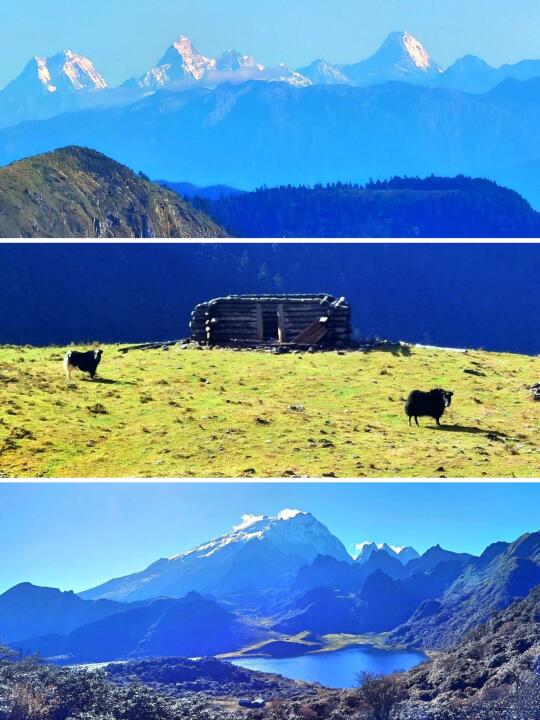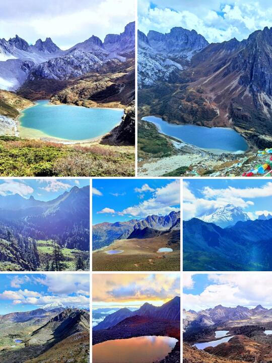 D2徒步15公里,为适应高反,可在第二、三牧场扎营:香格里拉→洗脸盆垭口(坐车37km1h,3720m)→检查站消防登记→往上经四个牧场→阿布吉措垭口(4380m,高底盘车能开到)→阿布吉措营地(15km,4260m,湖边不允许扎营)
