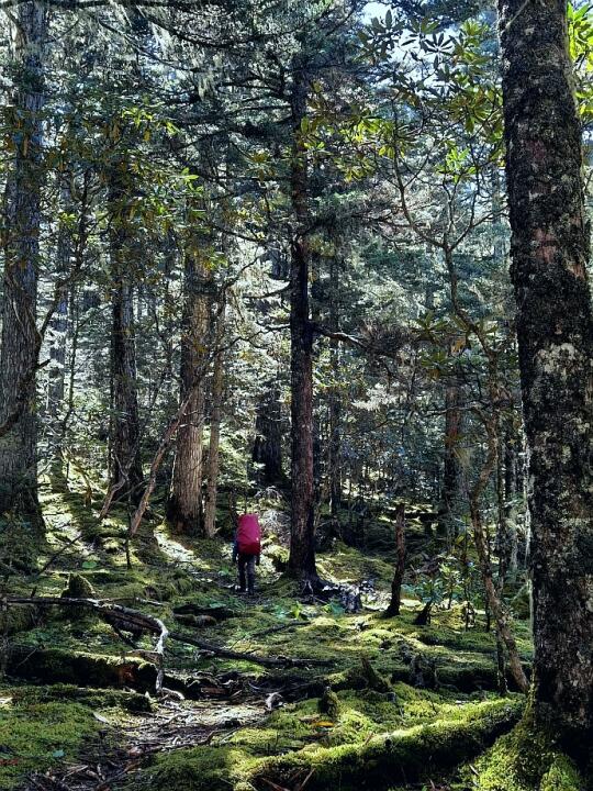 D7徒步12km,到老谷牧场后与来接的师傅汇合上车:营地→湾海(哈巴网红树,可往东下撤至哈巴村)→小黄海(可撤至哈巴村→吉支垭口(4340m)→哈巴雪山西坡大本营→麻花坪→白石湾→三岔河检查站→老谷牧场西坡咖啡营地(82km,3450m)→海巴洛客栈(89km,2830m)→丽江