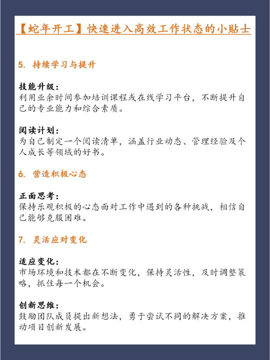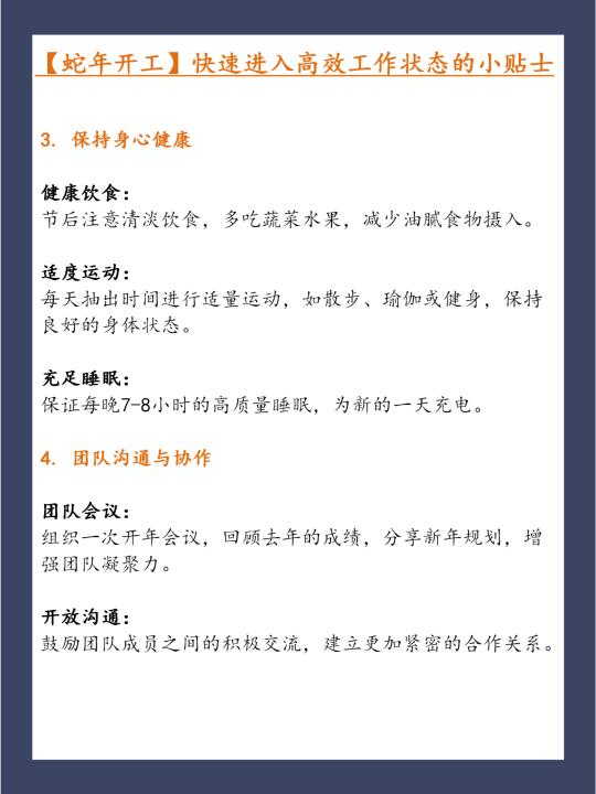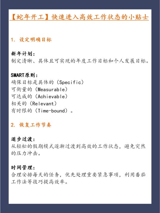 随着春节假期的结束,我们迎来了充满活力和机遇的蛇年。 为了帮助大家快速调整状态,以最佳姿态投入新一年的工作中,这里为大家准备了一些实用的“蛇年开工小贴士”。 让我们一起迎接挑战,开启新的征程吧! 蛇年大吉 新年开工 指南 攻略 工作 顺利 项目 工作日常 目标 沟通