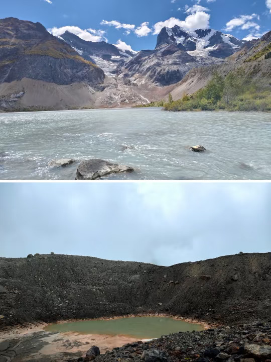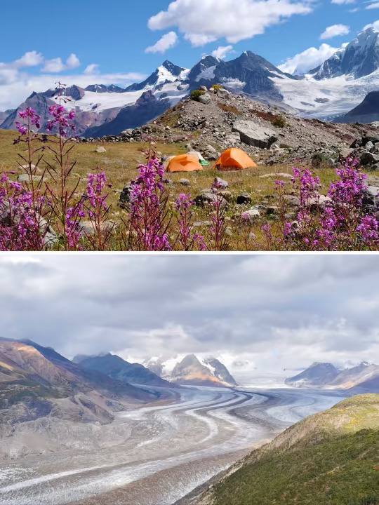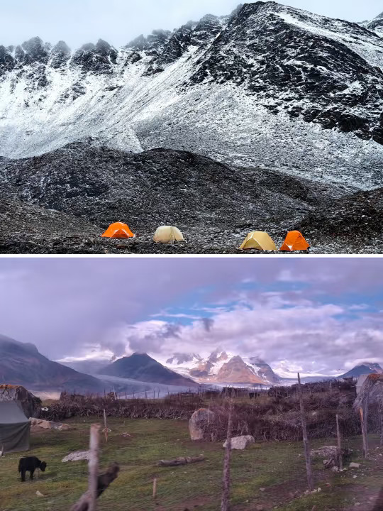 ✳️D3徒步11.8km。如头天不想在琼哥特牧场扎营,可继续往前行车约5公里开始徒步(起点附近有块小平地可扎营):营地→大平地(4330m)→徒步起点→滑坡路(4480m)→废弃牛棚(4510m)→岔口路营地(4660m)