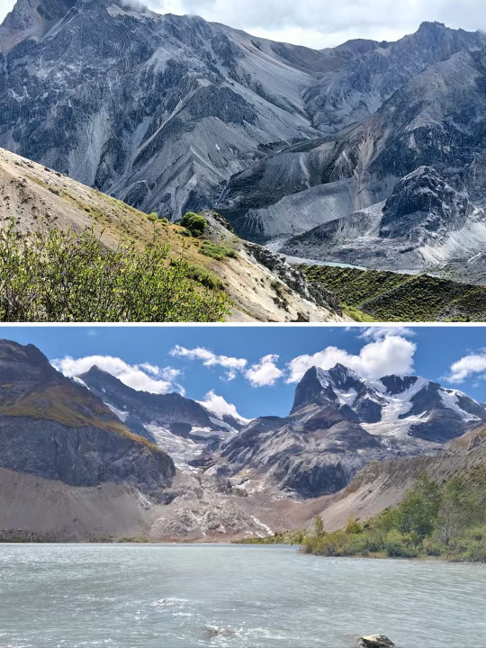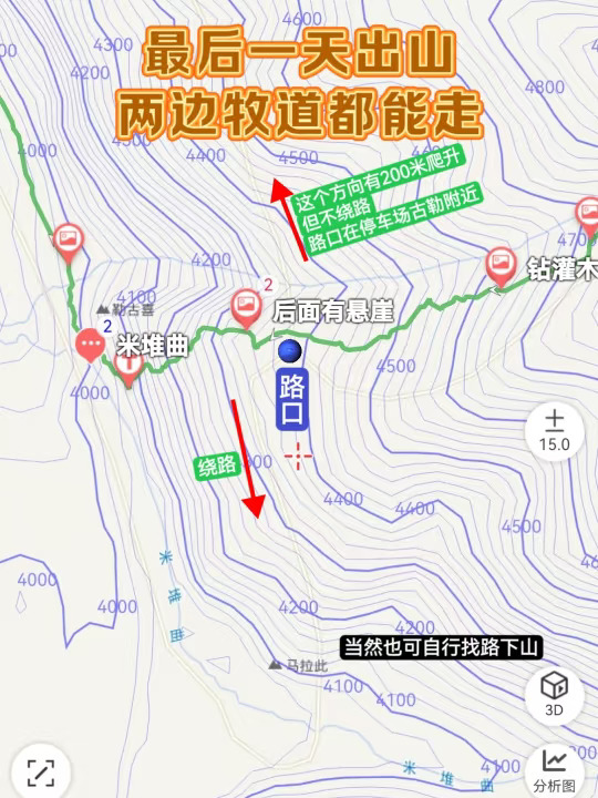 ✳️D7徒步9.5km。此段实际徒步距离得看下坡方式,按以前的路迹直下后段为断崖,选择绕行至马拉此会多几公里;从营地往右边走,需爬升约200米横切可以下到米堆景区停车场:营地→下到米堆曲牧道(4060m)→沿牧道出山→木屋(3930m)→机耕道(3800m)→古勒/停车场(3760m)