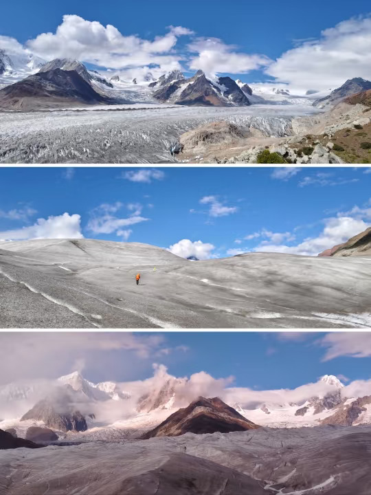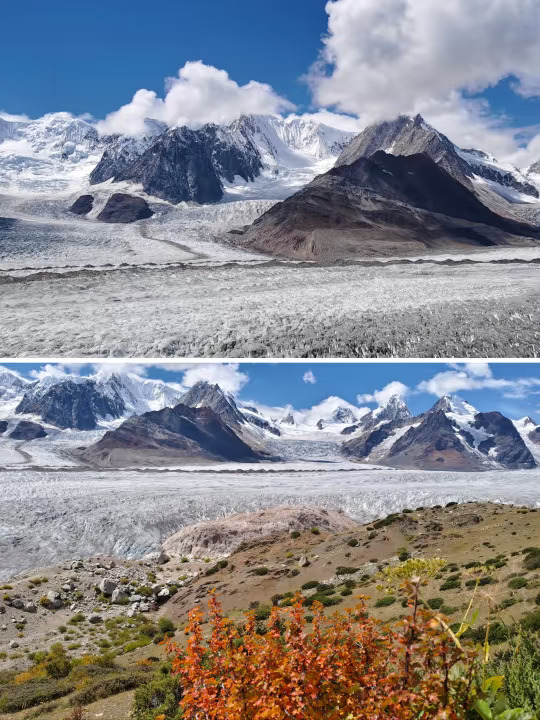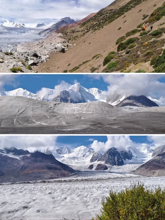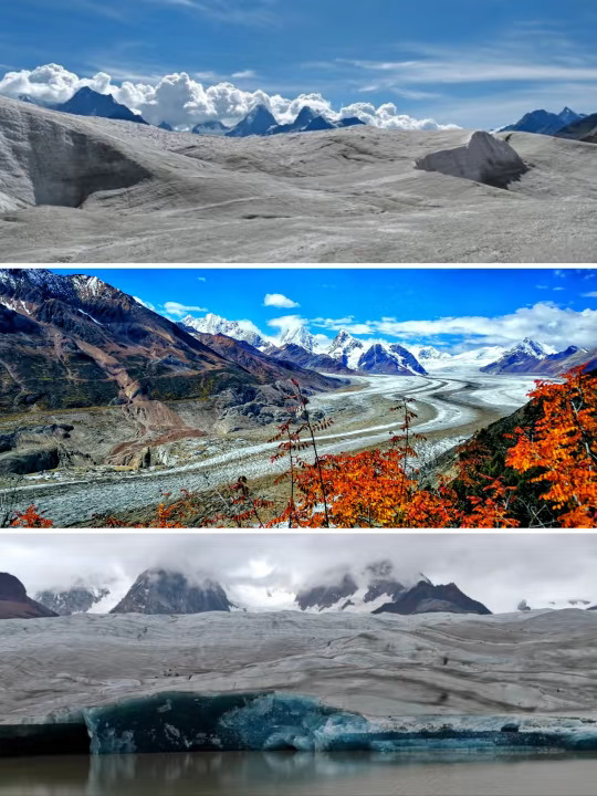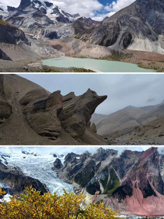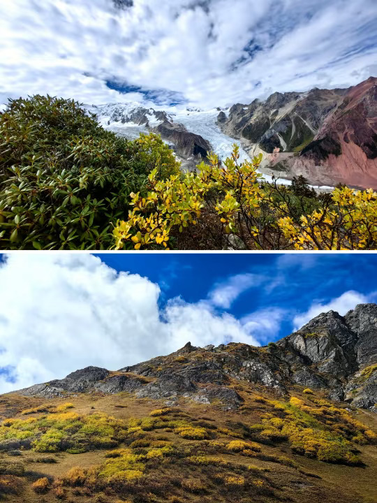 ✳️D6徒步10km:营地→陡坡下行→下到海拔约4700后再往左边爬坡→上坡→上垭口牧道→斜切→米拉拉垭口(5300m)→下到5100→上5200垭口(可见米堆冰川)→下坡→钻灌木林→勒古喜牧场营地(4400m)