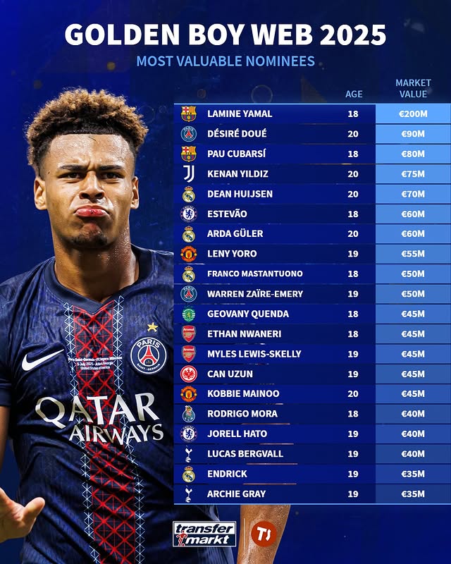 虎扑10月28日讯德转盘点25年金童奖候选名单身价排名,亚马尔、杜埃、库巴西排名前三。
