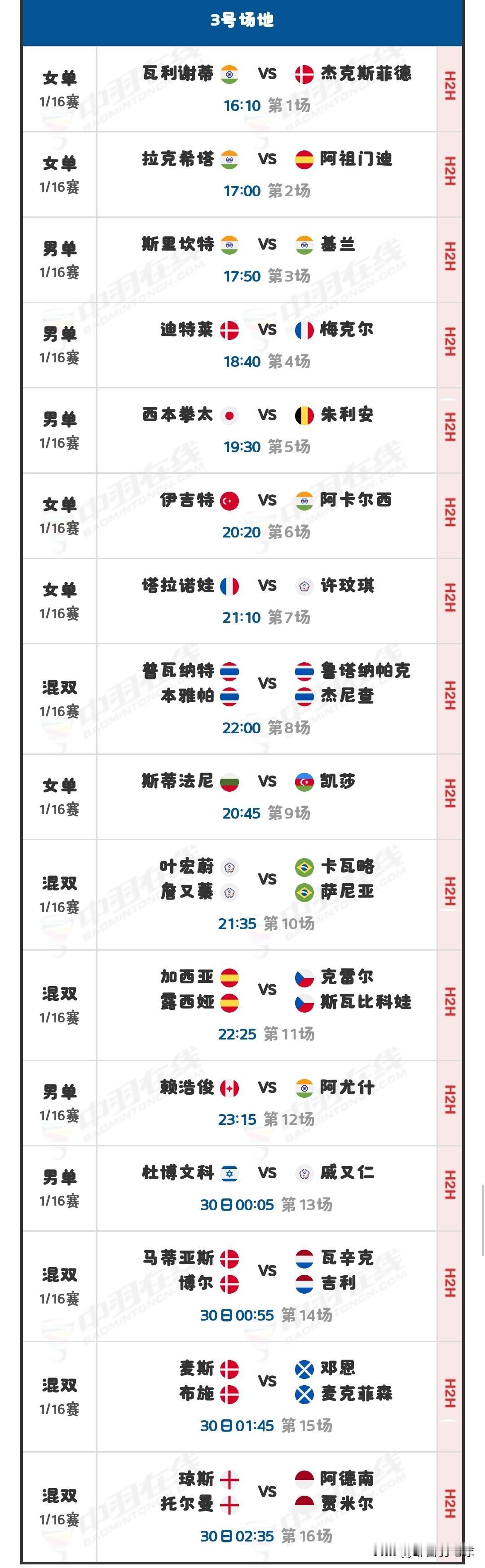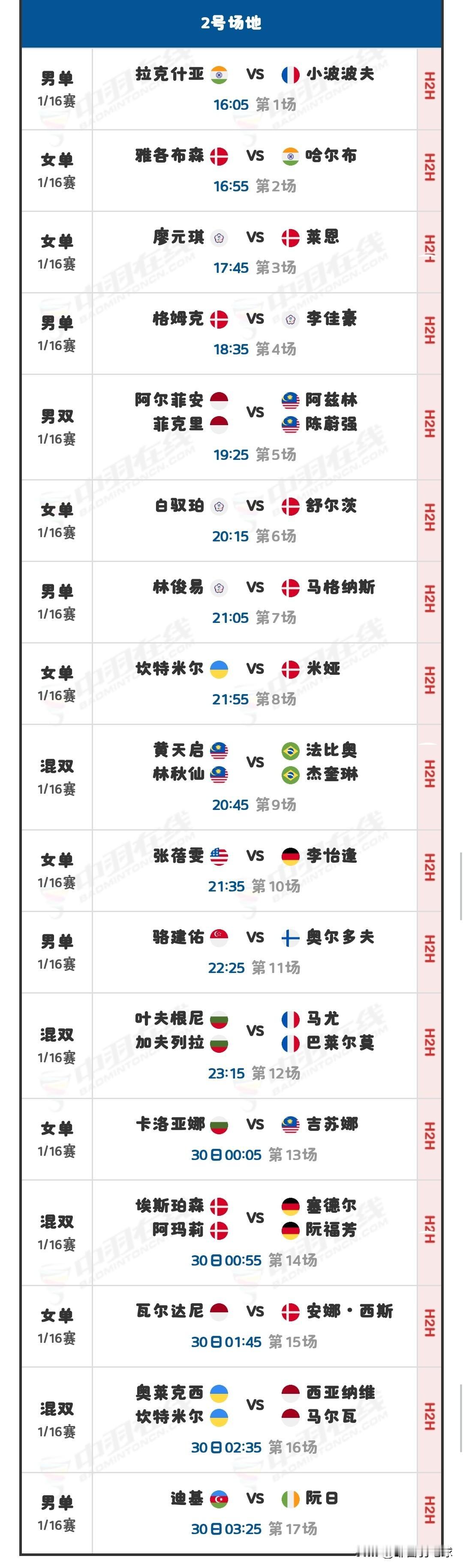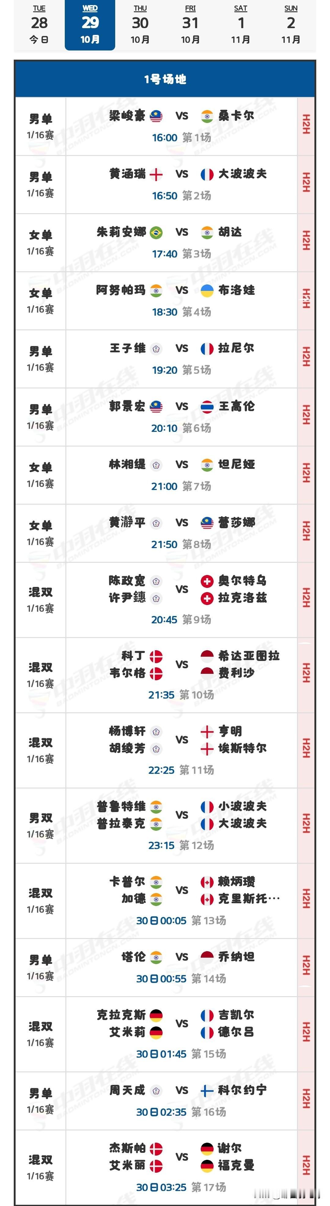 10月29日海露羽毛球公开赛1/16决赛(二)安排 昨日,2025年海露羽毛球公开赛的资格赛与1/16决赛(一),也就是首轮1/16决赛上半区的赛事顺利举行。 今日北京时间16:00,1/16决赛(二),即首轮1/16决赛下半区的比赛即将打响,届时将有三块场地同时开赛,具体对阵安排如下: 羽毛球赛事 羽毛球 羽毛球爱好者 羽毛球比赛