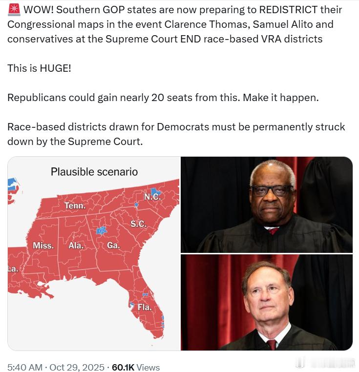 美国南部的共和党州正准备在最高法院大法官克拉伦斯·托马斯、塞缪尔·阿利托以及其他保守派大法官终结基于种族划分的《选举权法案》选区的情况下,重新划分国会选区地图。