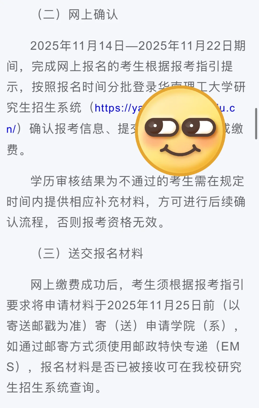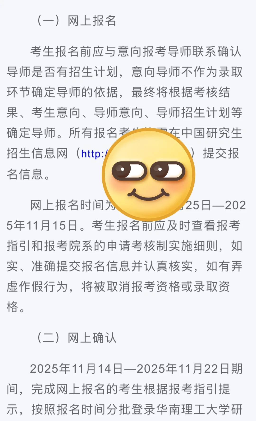 考生报名前应与意向报考导师联系确认导师是否有招生计划,意向导师不作为录取环节确定导师的依据,最终将根据考核结果、考生意向、导师意向、导师招生计划等确定导师。所有报名考生均需在中国研究生招生信息网提交报名信息。网上报名时间为2025年10月25日—2025年11月15日。考生报名前应及时查看报考指引和报考院系的申请考核制实施细则,如实、准确提交报名信息并认真核实,如有弄虚作假行为,将被取消报考资格或录取资格。(二)网上确认2025年11月14日—2025年11月22日期间,完成网上报名的考生根据报考指引提示,按照报名时间分批登录华南理工大学研究生招生系统(https://yanzhao.scut.edu.cn/)确认报考信息、提交相应资料,完成缴费。学历审核结果为不通过的考生需在规定时间内提供相应补充材料,方可进行后续确认流程,否则报考资格无效。(三)送交报名材料网上缴费成功后,考生须根据报考指引要求将申请材料于2025年11月25日前(以寄送邮戳为准)寄(送)申请学院(系),如通过邮寄方式须使用邮政特快专递(EMS),报名材料是否已被接收可在我校研究生招生系统查询。
