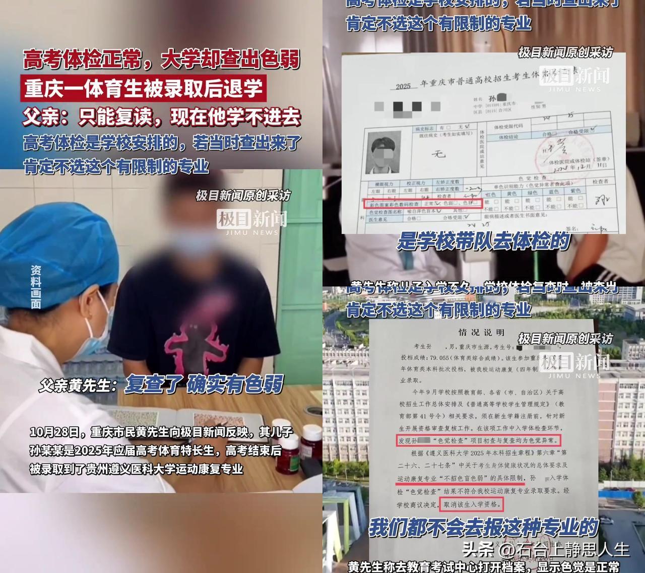 高考体检的正常,居然坑了孩子! 重庆体育生孙某某,学校安排的高考体检色觉查的正常,被录取到遵义医科大学运动康复专业。结果大学复检查出色弱,这专业不招色弱,不能转专业只能退学,现在孩子回家复读,根本学不进去。 有人说高考体检肯定有猫腻,要么孩子瞒了要么医院漏查;也有人说学校太绝情,调剂个不限的专业不行吗;还有人说自己没看专业限制,怪谁? 可我就想问,高考体检是学校安排的,孩子能不信吗?要是当时查出来,谁会报这个专业?学校明明能调剂,为啥非要逼孩子复读?这不是毁人吗? 大家怎么看?