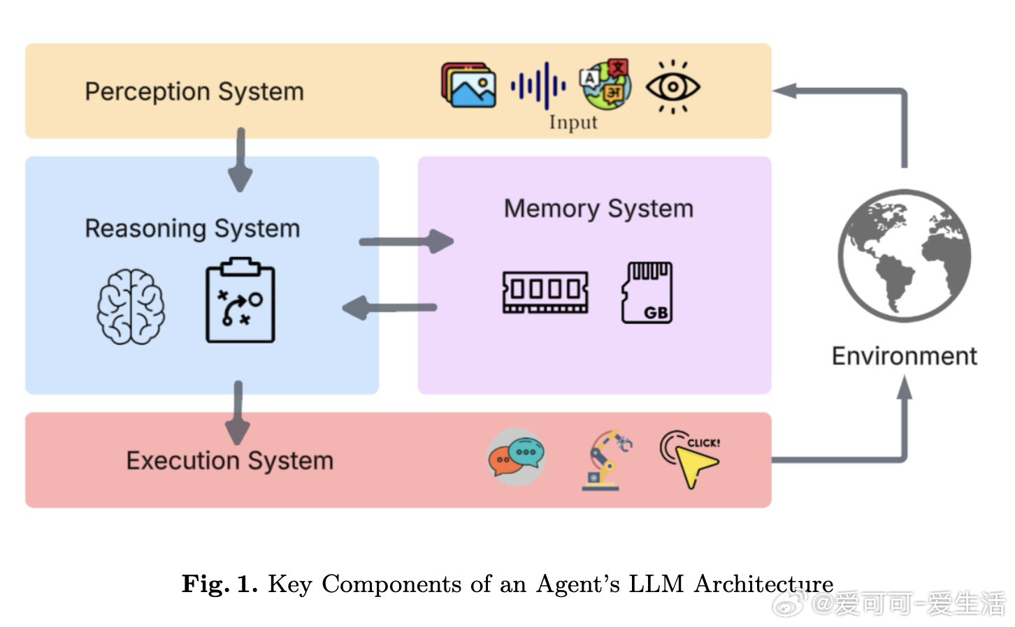 1. 感知系统:将环境输入(文本、图像、结构化数据等)转换为模型可理解的语义表示。多模态LLM(MM-LLM)通过视觉编码器和文本编码器融合信息,增强对图形界面和现实世界的理解。同时利用工具调用如网页搜索API、专业数据库接口等扩展感知能力。