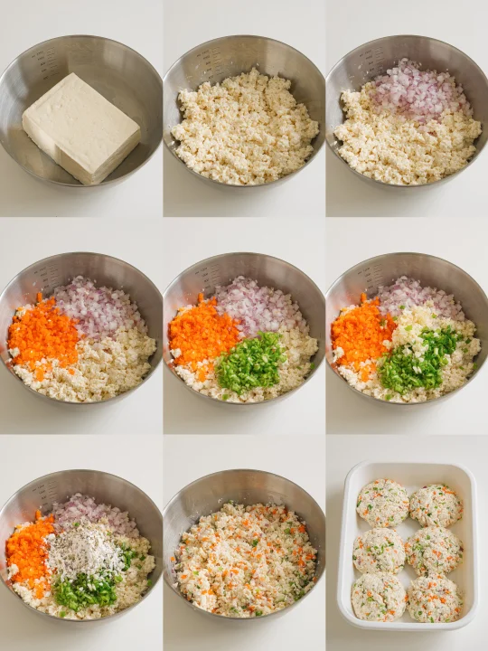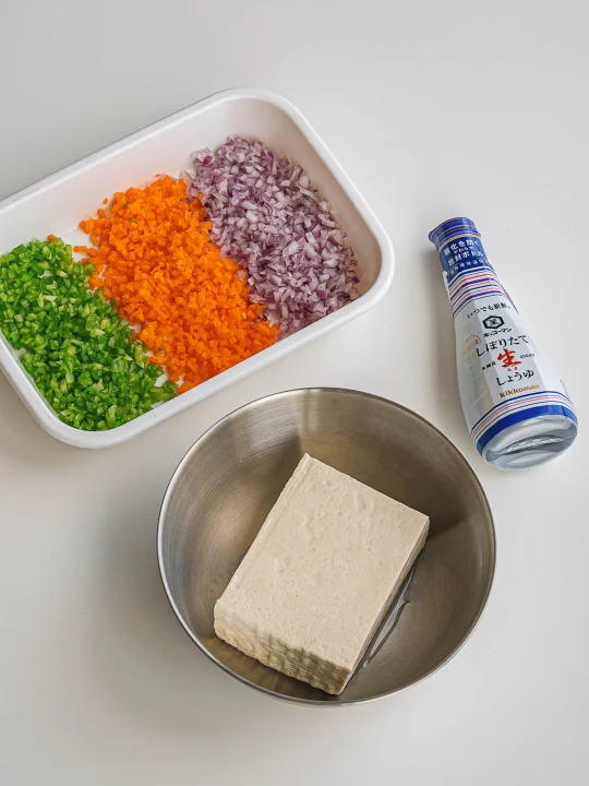 ❷放入洋葱丁、胡萝卜丁、青椒丁、葱花、蒜末、淀粉、海盐黑胡椒,拌匀