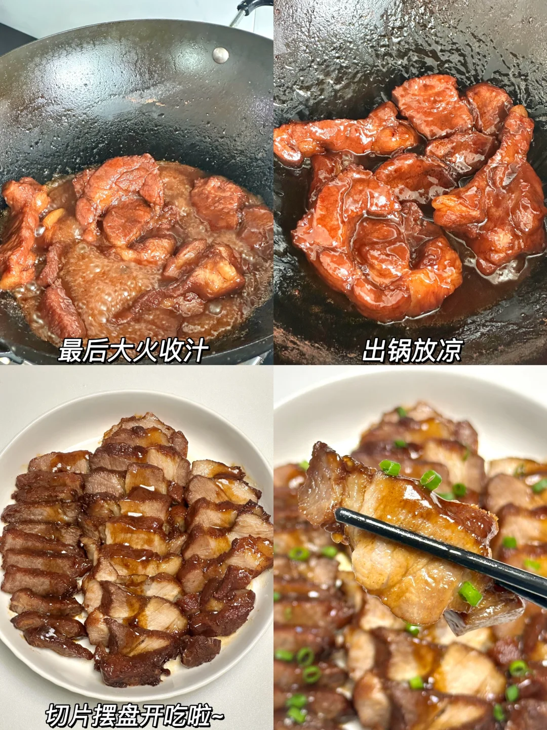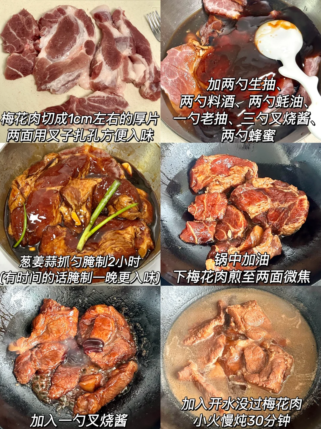 宅家也可以做的蜜汁叉烧!!爱吃叉烧的老公再也不用出去吃啦~做法还简单😋出锅全家都夸的程度哦!! 🌟食材🌟 梅花肉两斤、葱姜大蒜 🌟做法🌟🌟 1️⃣梅花肉切成1cm左右的厚片,两面用叉子扎孔方便入味 2️⃣加两勺生抽、两勺料酒、两勺蚝油、一勺老抽、三勺叉烧酱、两勺蜂蜜、葱姜蒜抓匀腌制2小时(有时间的话腌制一晚更入味哦) 3️⃣锅中加油,下梅花肉煎至两面微焦,加入一勺叉烧酱,加开水没过梅花肉,小火慢炖30分钟,最后大火收汁 4️⃣出锅放凉切片即可 真的巨巨巨好吃!!家里老人小孩都爱吃~我女儿吃完了还要吃[笑哭R]配叉烧肉吃饭都快起来了~家人们快快学起来交作业呀😍