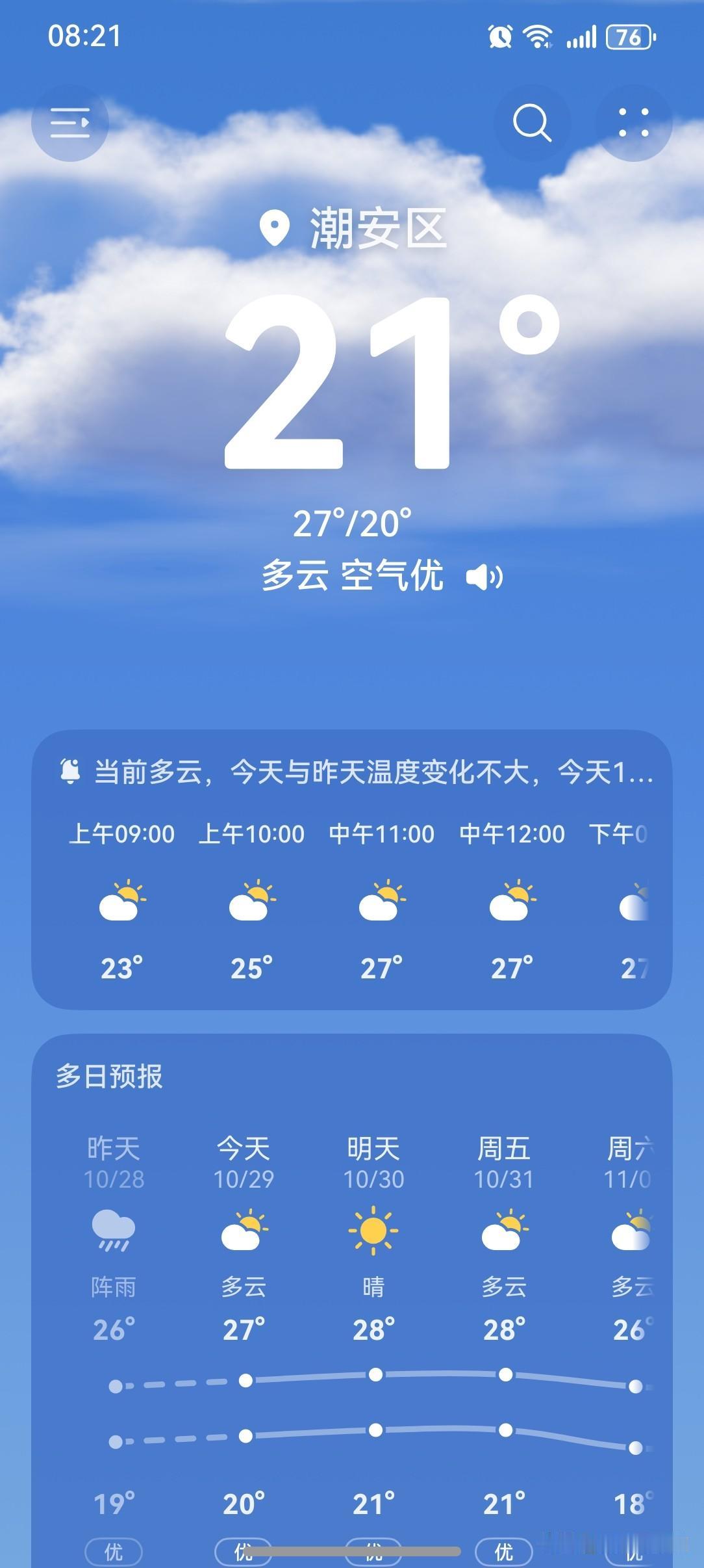 今日重阳, 重阳佳节话茱萸! 登高远望,饮酒赏菊,金秋九月,重阳又至! 品糕点,佩茱萸,簪菊花,放纸鹞…… 以上这些重阳习俗, 给我们一个充实的重阳节, 祝小伙伴们在重阳节吃好,喝好,玩好,样样都好! 秋高气爽,气温回升, 正是登高踏青好时节! 未来几天广东气温先升后降! 深圳、广州、韶关, 广东多地正式入秋, 广州迎本世纪以来第二早秋天! 29~31日, 我省云量较多, 粤西、珠江三角洲西部、韶关、清远等西部地区有分散小雨; 粤北偏北市县最低气温15~18℃, 早晚体感清凉; 我省海面有东北风6~7级阵风8级。 今天(29日), 潮州喜提一个多云转晴天气! 气温20~27℃, 此刻气温21℃, 体感温度23℃。 昨天持续的雨水暴击, 感觉冷了许多。 早上又下了一场雨, 幸好, 现在雨停了, 阳光也若隐若现了, 应该是放晴了吧? 看看今天的天空, 云量虽多, 但也抵挡不住太阳的万丈光芒! 这样的天气, 还是非常不错的, 值得获得一个五星好评! 如此天气! 元芳,你怎么看?
