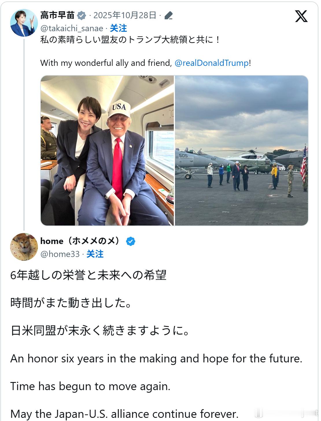 此次,高市早苗也获特朗普邀请同乘专机,并于当晚在社交平台X上发布了与特朗普在机舱内的合影。照片曝光后迅速引发日本网友热议,不少人留言称,“美日同盟的温度回来了”。