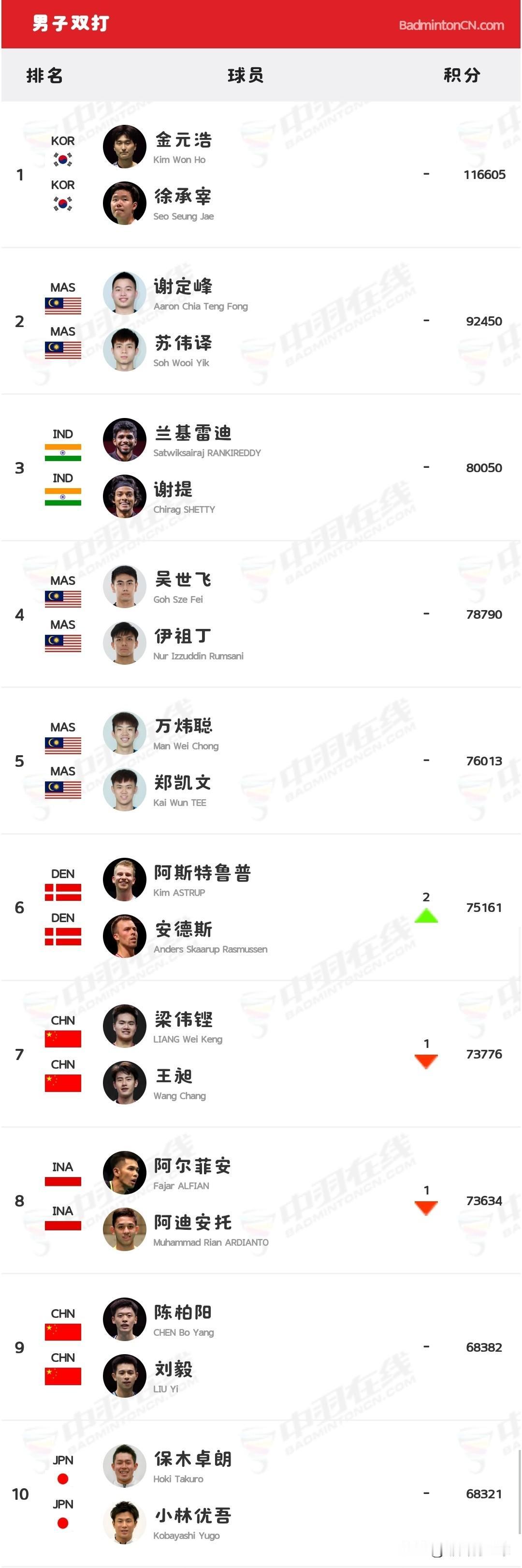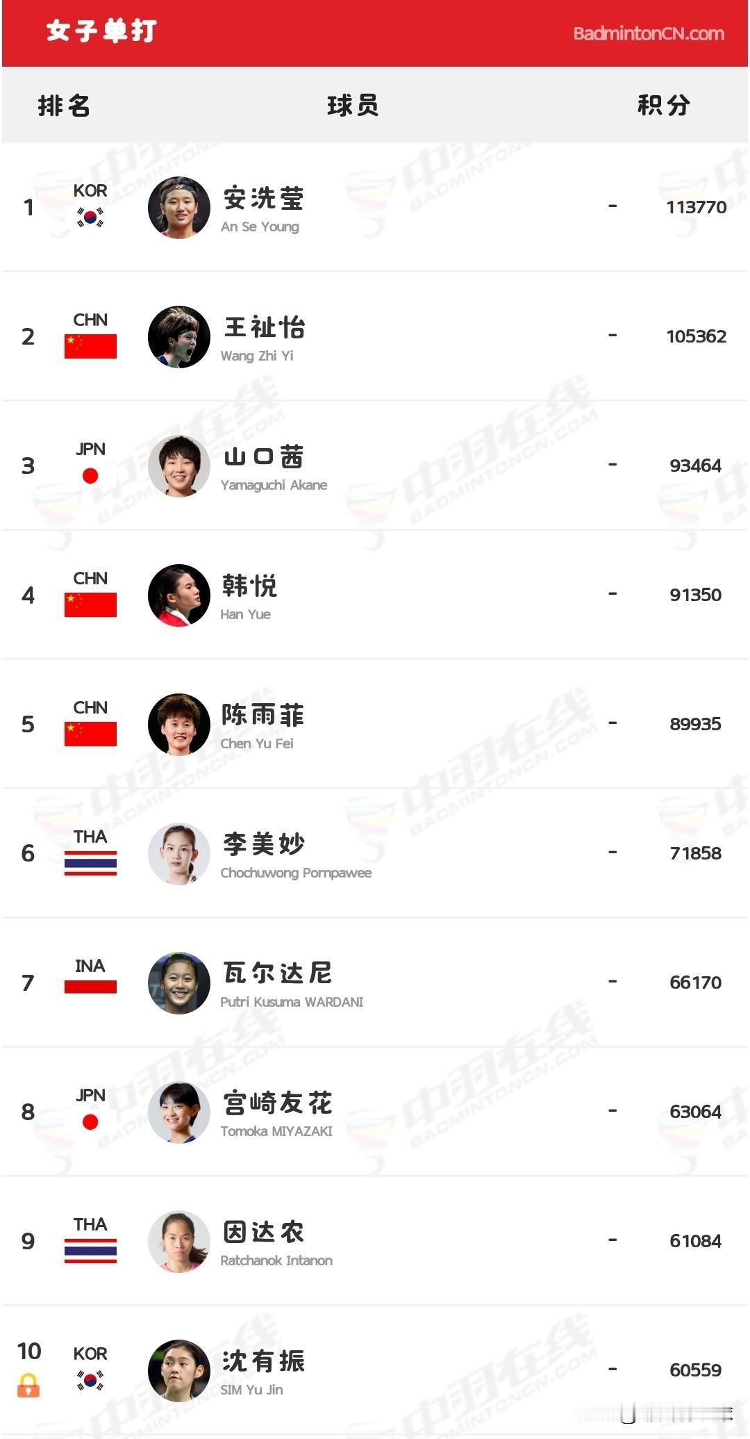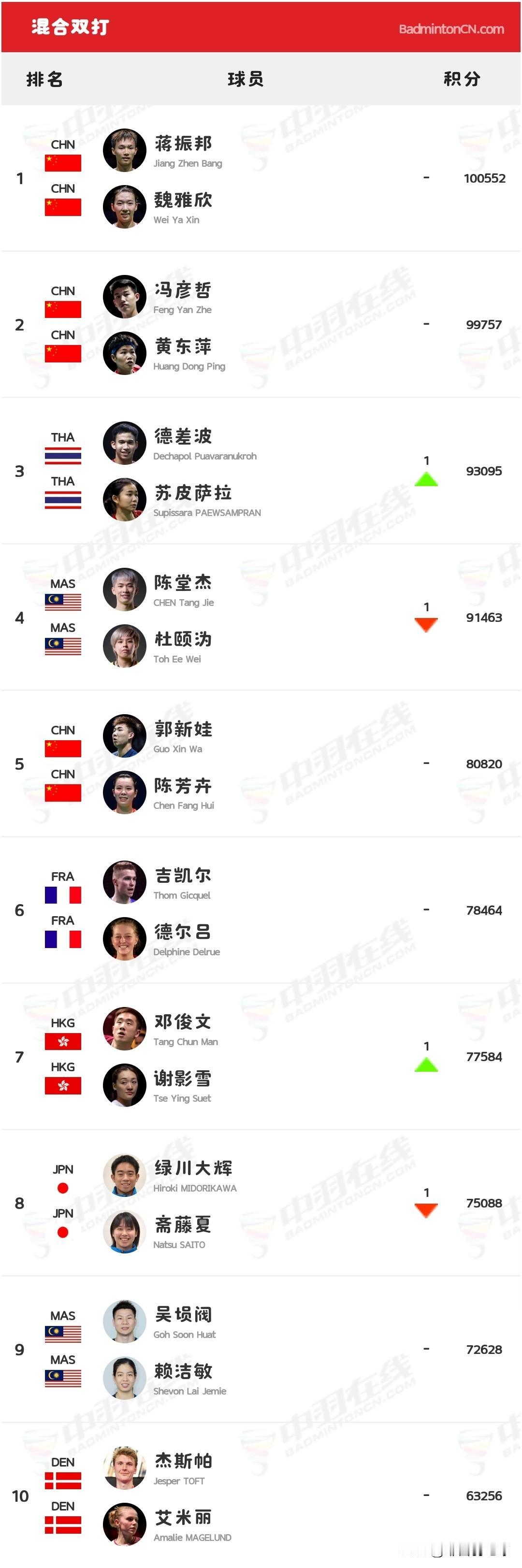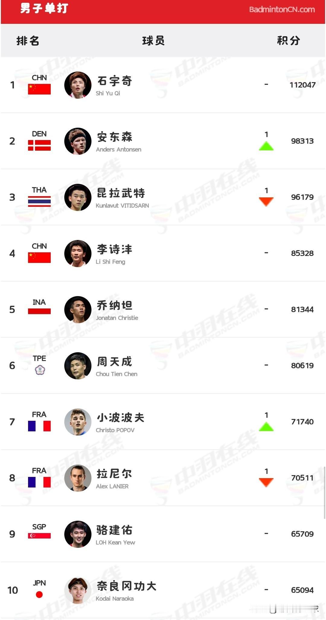 2025年世界羽联第44周排名前十名单 昨日,世界羽联公布了积分排名,前十名情况如下:国羽石宇奇依旧稳居男单世界第一,李诗沣位列第四;女单王祉怡排名第二,韩悦、陈雨菲分别排在第四和第五;男双梁王组合下滑一位,排至第七,一百分组合排在第九;女双圣谭组合持续稳坐榜首,凡贤组合排在第四,李怡婧/罗徐敏排在第九;混双酱板鸭组合和凤凰组合继续保持第一和第二的名次,郭新娃/陈芳卉排在第五。 羽毛球排行 羽毛球 羽毛球公开赛 羽毛球比赛 羽毛球爱好者