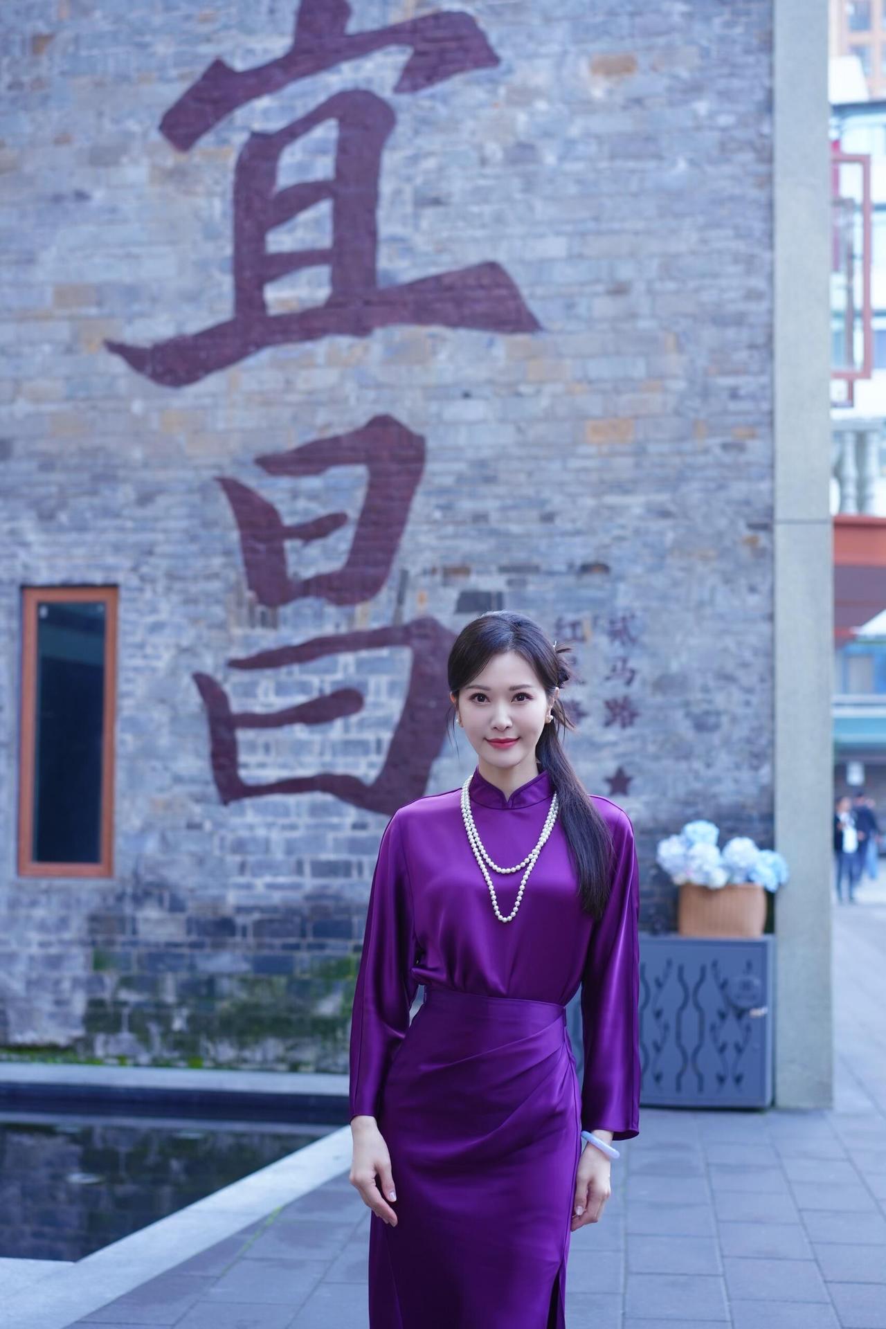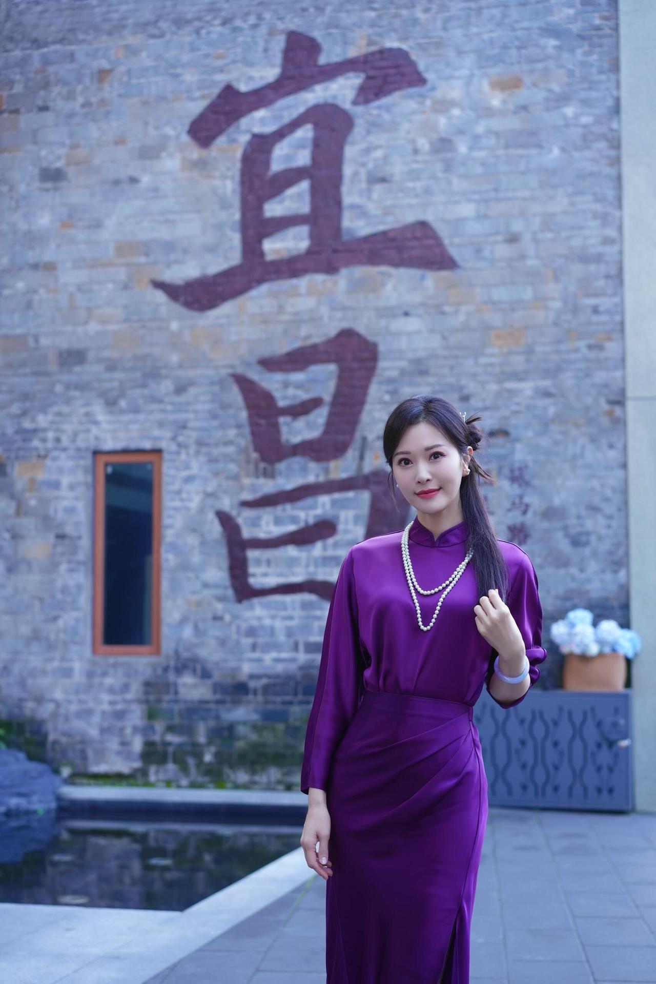 主持人谢映玲紫色旗袍穿搭真有韵味!