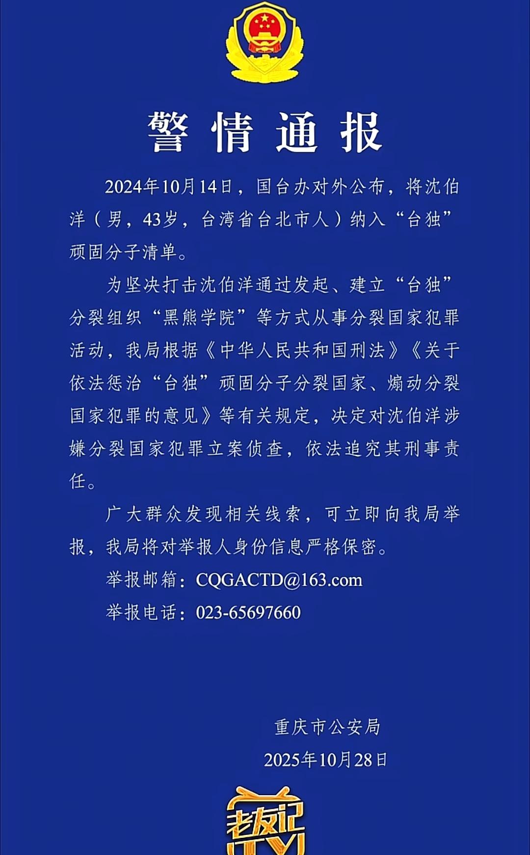 一觉醒来! 高安国将军刚遭民进党迫害判刑, 沈伯洋就被大陆警方立案侦查,这哪是巧合, 分明是精准回击的正义铁拳! 别以为沈伯洋只会耍嘴皮子, 他一边靠家族企业赚大陆的钱, 一边建"黑熊学院"洗脑年轻人搞分裂, 还敢否定历史、打压统派。 之前被列入顽固分子清单还嘴硬, 如今立案通报一到, 立马删言论、转资产, 这怂样简直没眼看。 有人说这是"杀鸡儆猴", 我倒觉得这是"精准清障"。 不是不收拾, 是等证据确凿再动手, 既给了改过机会, 更显法律威严 。 这种"赚大陆钱砸大陆锅"的双面人, 就得让他付出代价。 统一从来不是空话, 对统派的支持、对分裂的严惩, 都藏在这些行动里。 你觉得这记"铁拳"能敲醒多少执迷不悟的人?