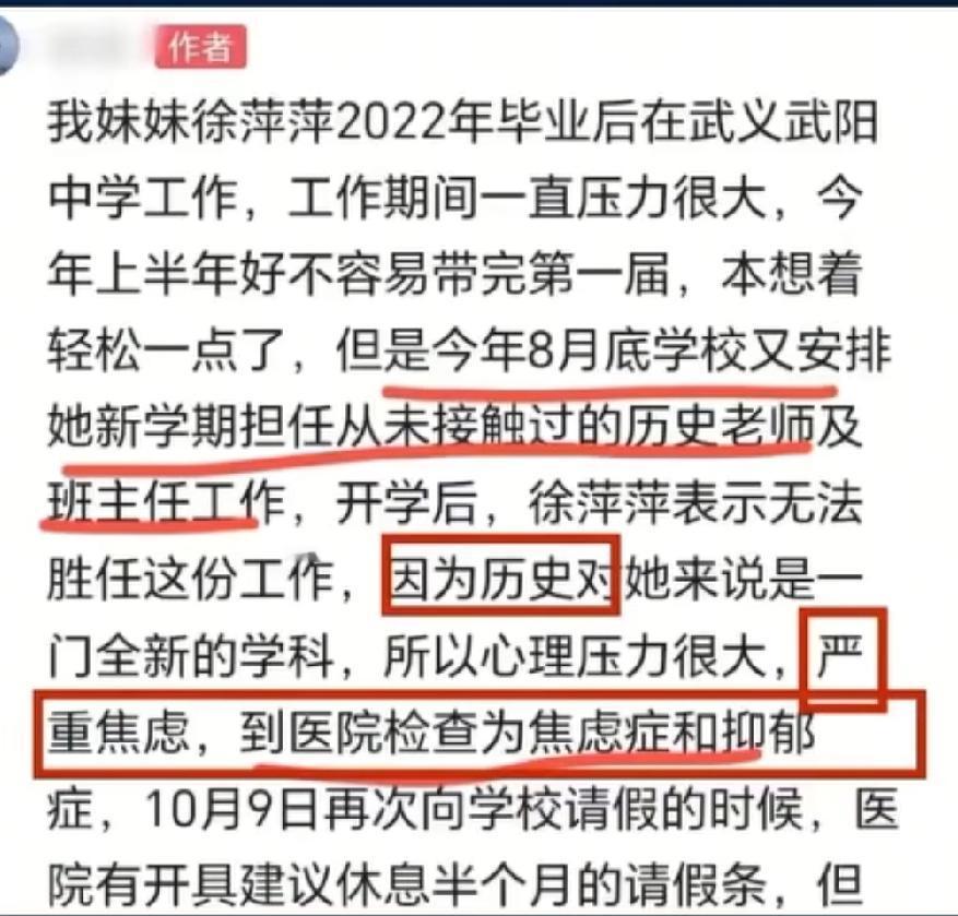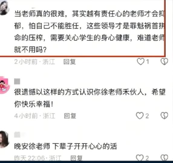 老师上吊自杀!学校让她教不擅长的历史兼职班主任,导致焦虑抑郁最后选择这样的方式结束! 一路走好!但是如果连这点压力都受不了,还怎么教学生坚强乐观、永不放弃、永不言败? 23年有个女教师从教学楼4楼跳下来,大难不死,只是后面几十年要靠拐杖生活了,不明白有什么过不去的?!要这么极端?? 常言说为人师表。就佩服邓稼先。在癌症第3次手术之前,还要写建议书,为了中国的科技发展,为了中国的强大。