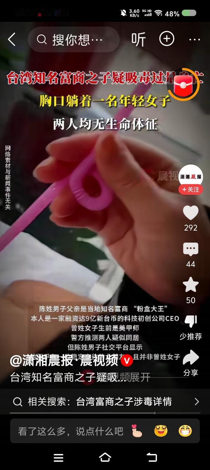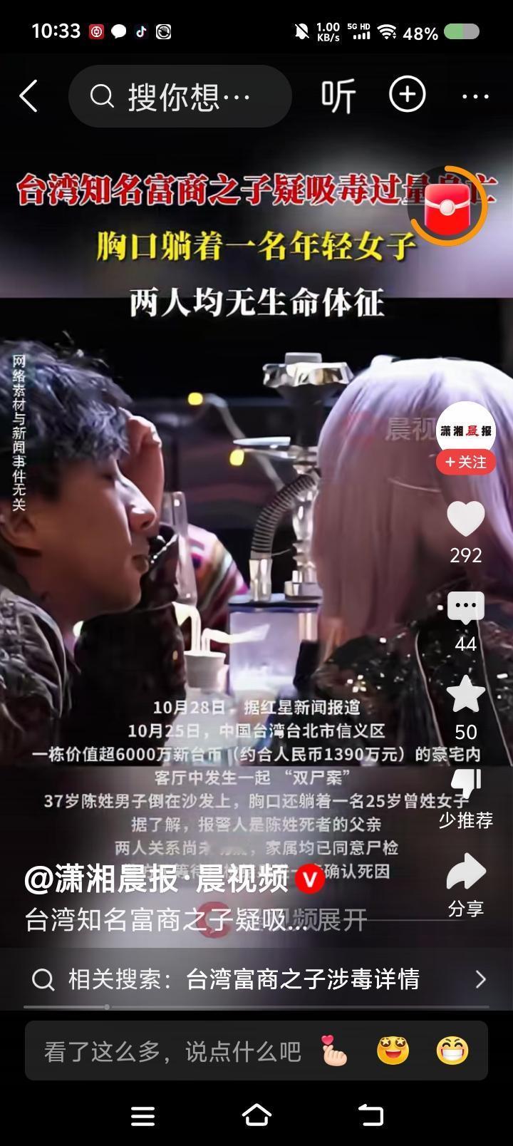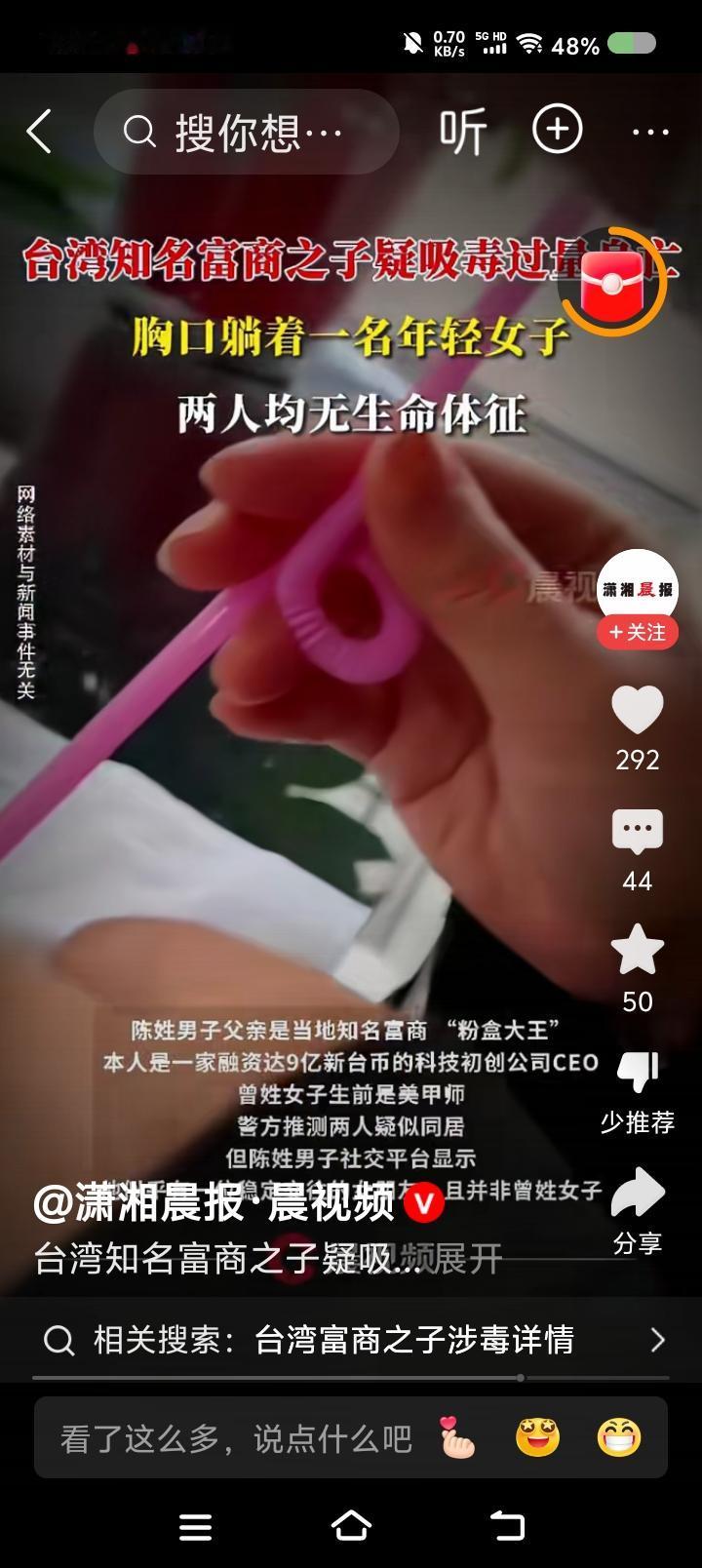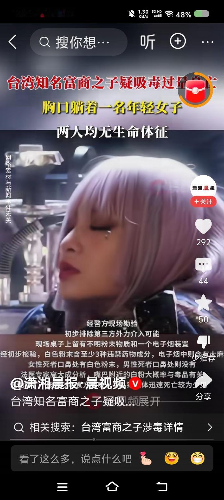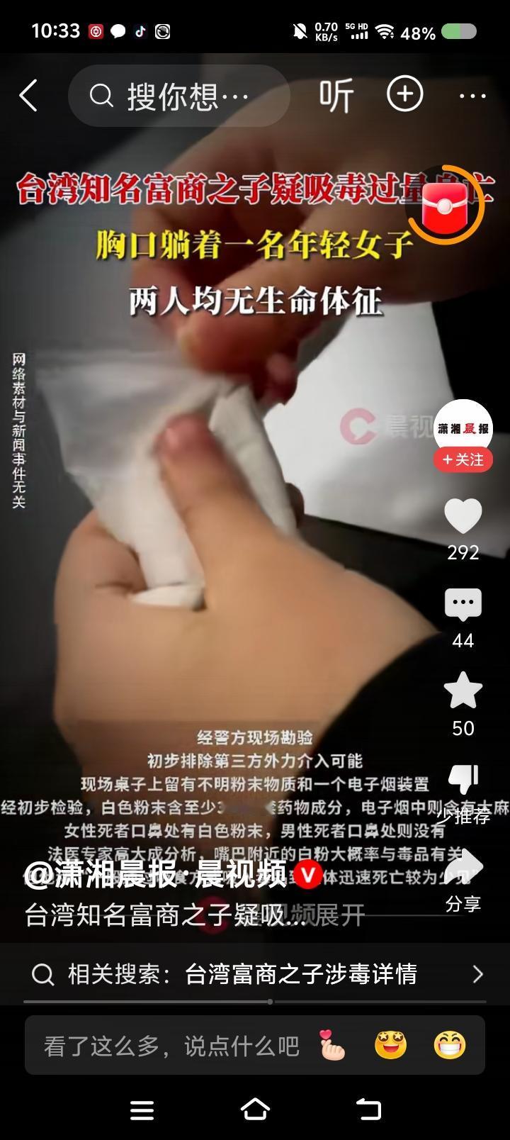 台湾“双尸案”!—— 据报道,台湾某富商之子与一女子疑似吸du身亡!女子躺男子胸口。躺在价值6000万新台币的房子里。桌上有电子烟与不明粉末。 点评: 这场面怎么形容?富丽堂皇为哪般?沾上毒物鬼门关。 上周,单位组织了一次禁毒讲座。专家讲,du品离我们并不遥远,有的在柴火堆里,一点燃,释放出来了;有的放在饮料、食品里…… 专家强调,国外并没有“du品”的概念,中国设立的。在国外,它就是麻醉药品和精神药品,其滥用就是咱们说的“吸du”。 所以,在我国,打击du品犯罪,除了常规办法,规范药品管理也是关键。