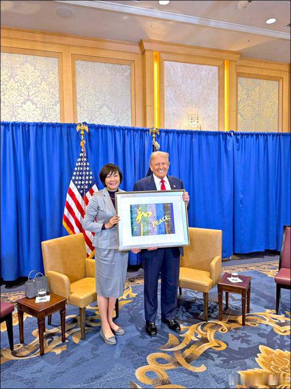 图1:美国总统特朗普28日晚间与安倍晋三遗孀安倍昭惠会面,昭惠送给特朗普1幅写着「和平」的字画,似乎与日本首相高市早苗表示将推荐特朗普角逐诺贝尔和平奖有所呼应。 (取自安倍昭惠X)